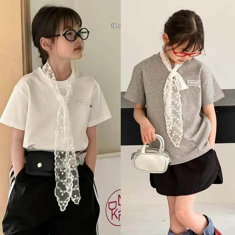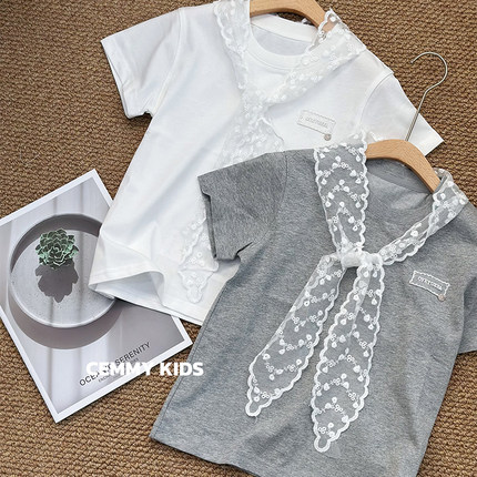 大E小e夏季新款儿童蕾丝飘带T恤