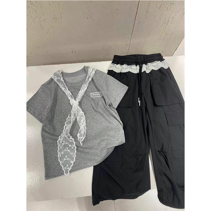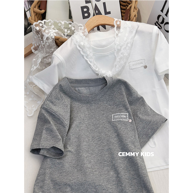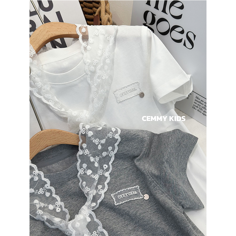 嗨大E小e2025夏装新款女中大童气质款亲子蕾丝花边短袖T恤25095