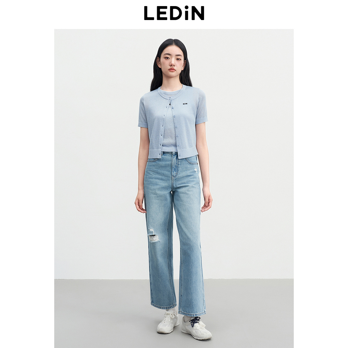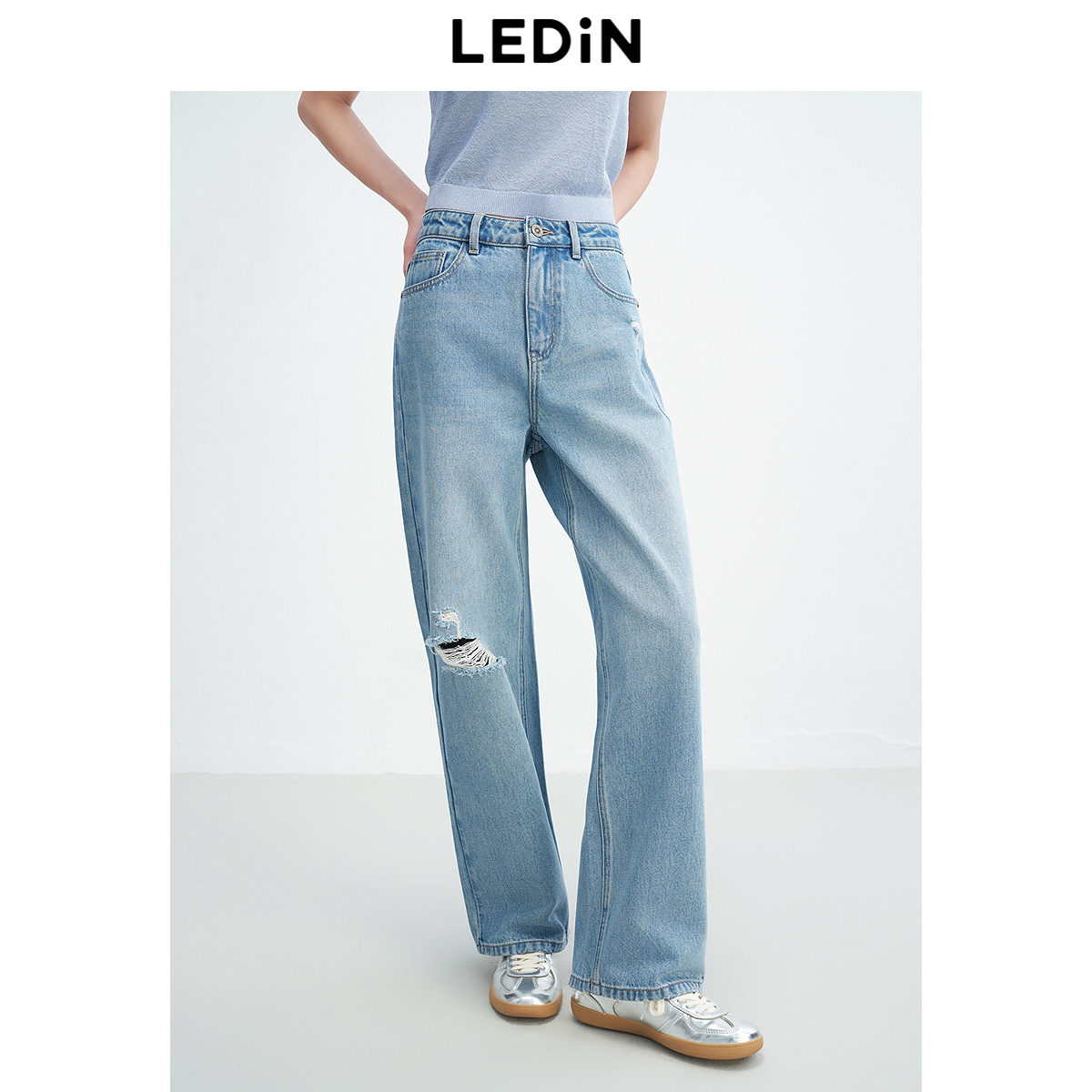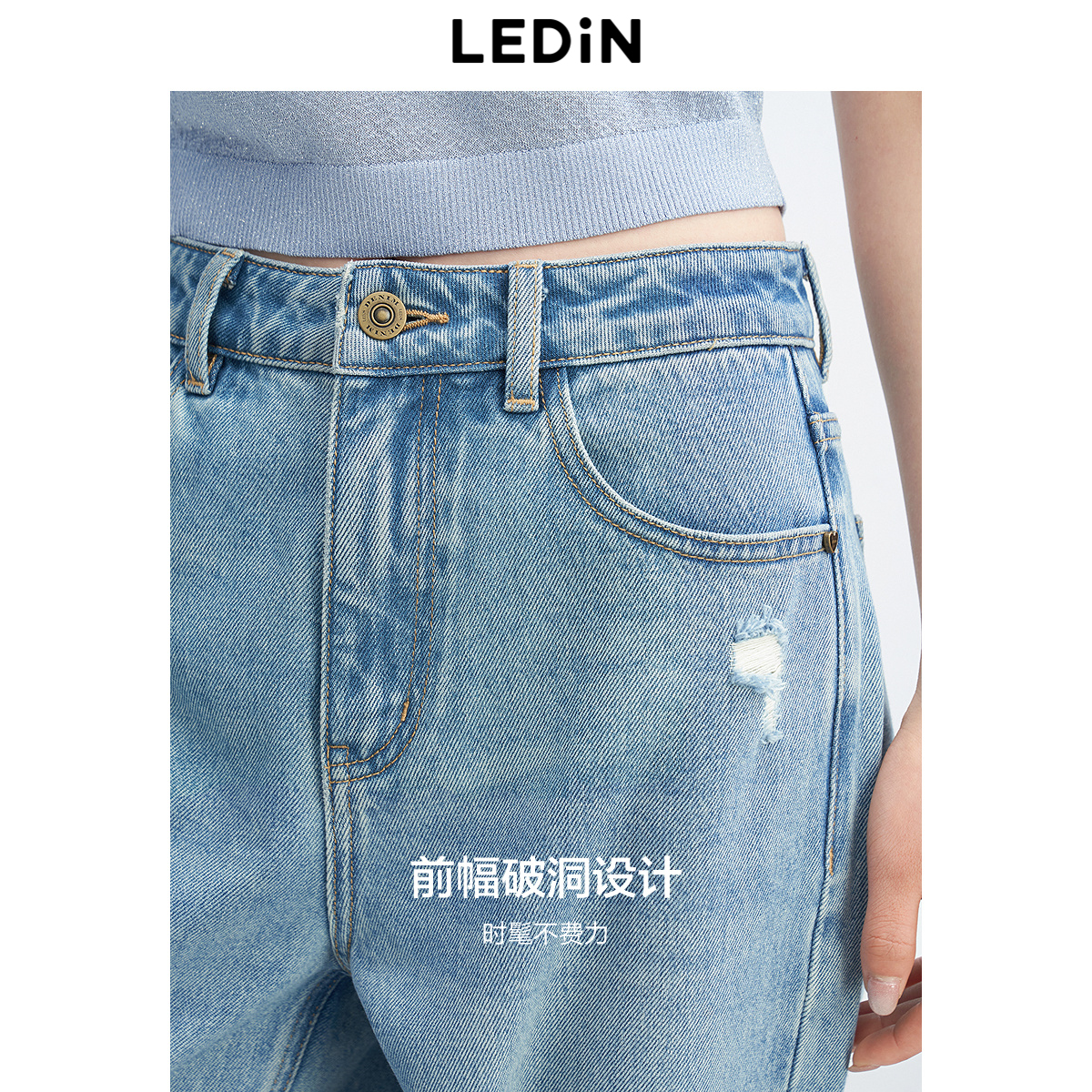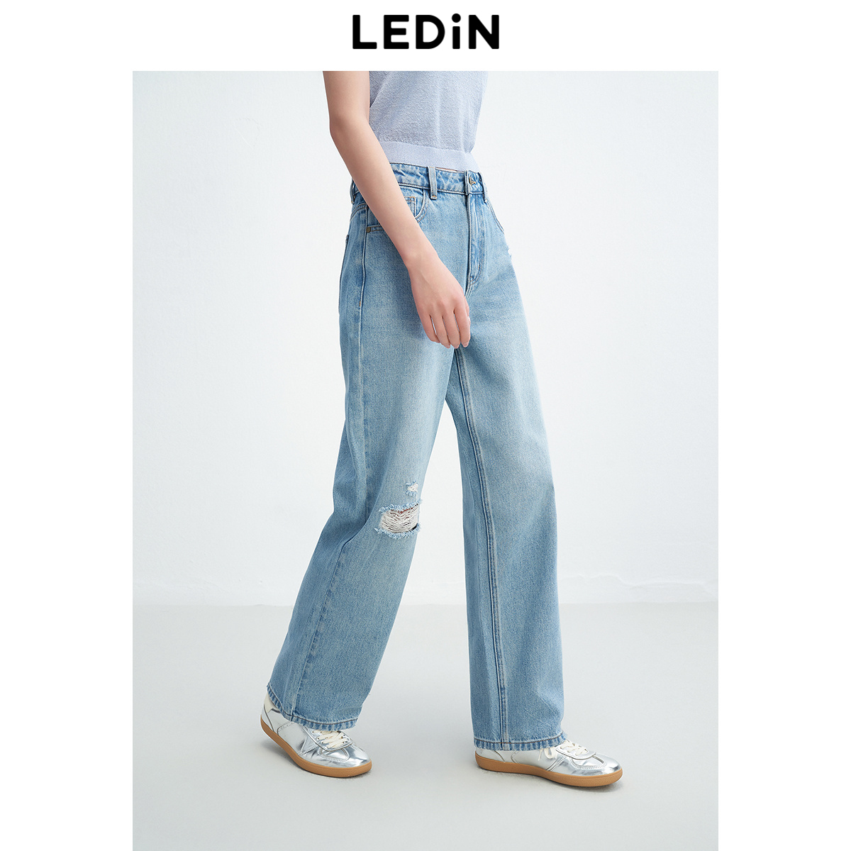 乐町高腰破洞设计牛仔裤2025年夏季新款复古直筒宽松阔腿牛仔裤女