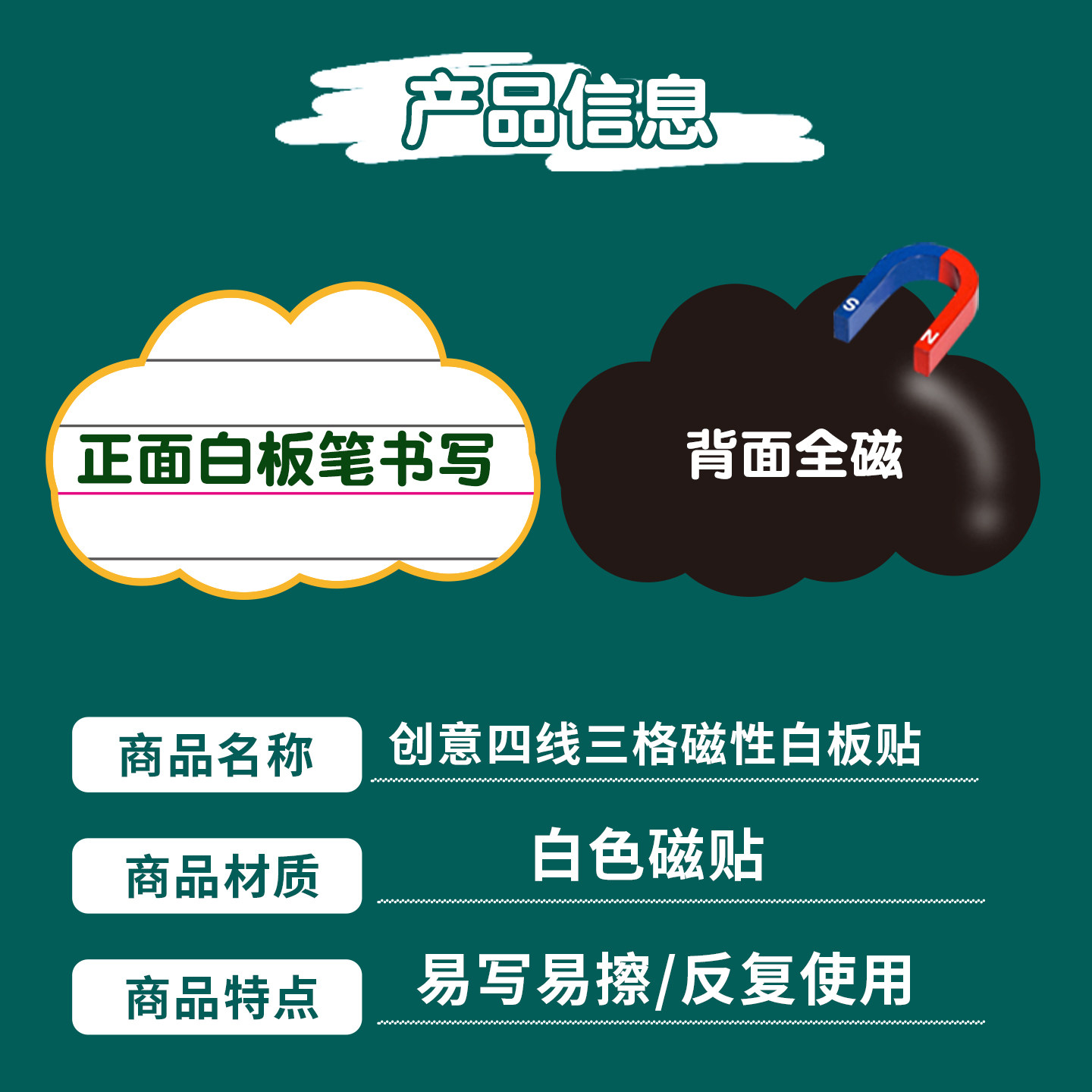 数学英语文教老师课堂比赛公开课四线三格空白磁性白板贴创意可擦写移除黑板贴板书贴卡片神器磁力贴教学教具