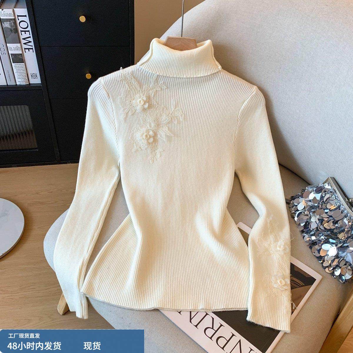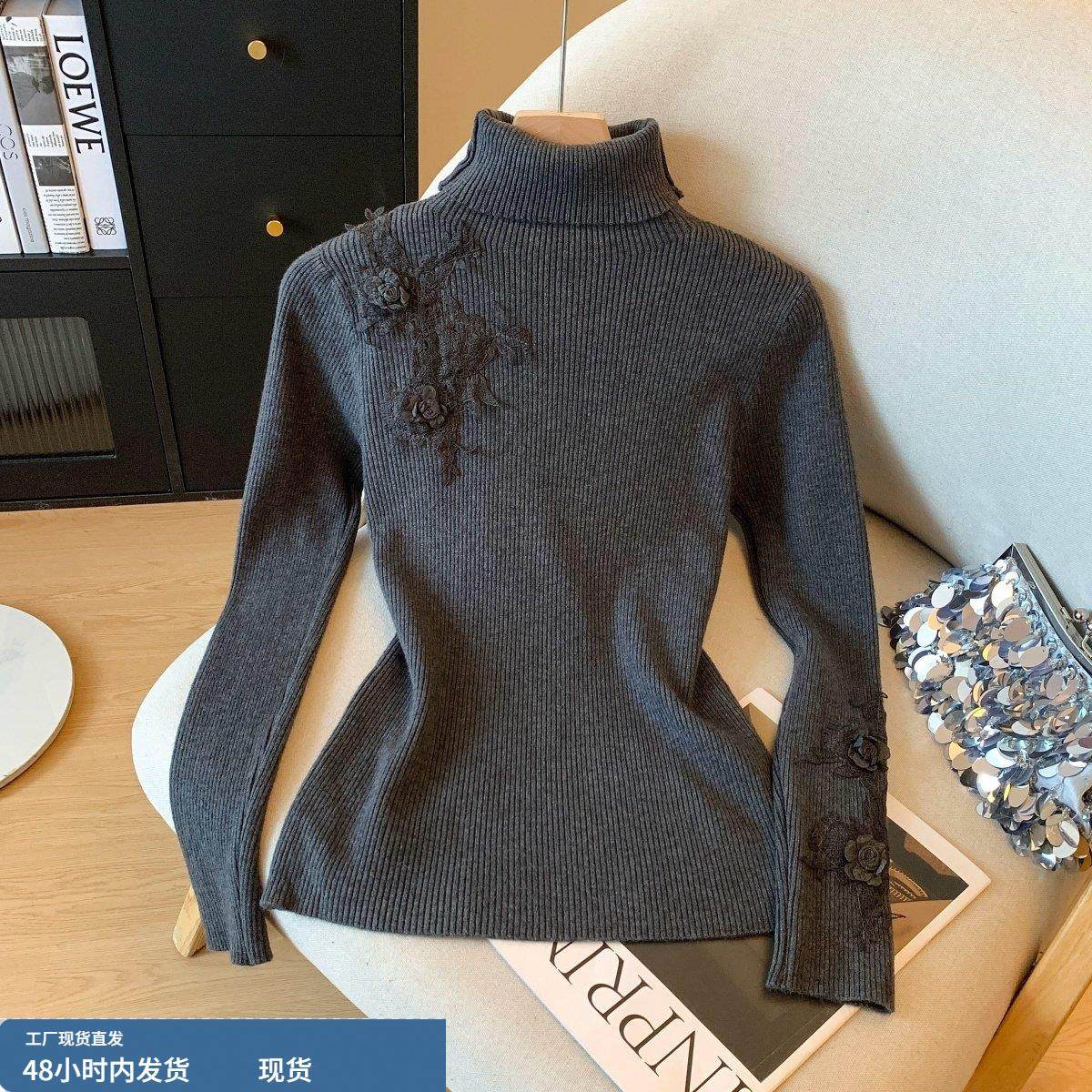 灰色刺绣高领针织打底衫女冬季皮草内搭大朗毛衣义乌掐腰软糯上衣