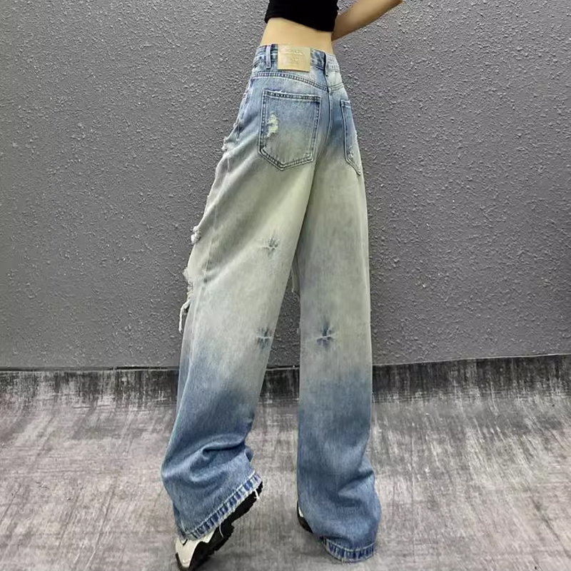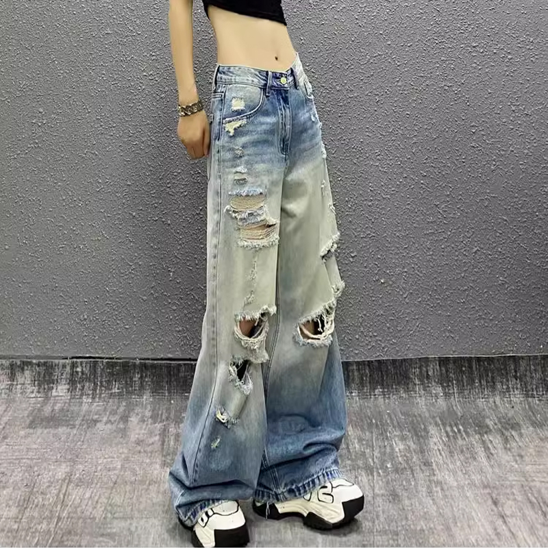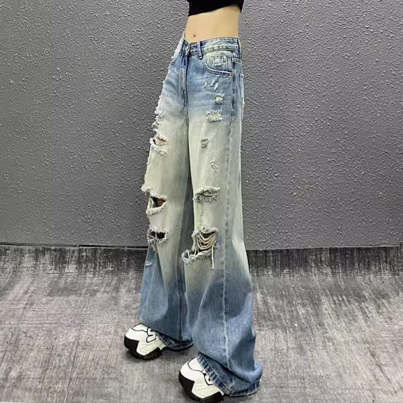 破洞垂感蓝色牛仔裤女2025夏新款帅气高腰宽松显瘦百搭直筒阔腿潮