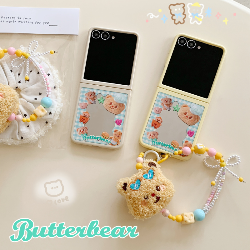 ins法式可爱奶黄小熊蓝格子镜子适用三星zflip6手机壳小米MIXFlip镜面全视窗zflip5防摔W24Flip个性保护套女