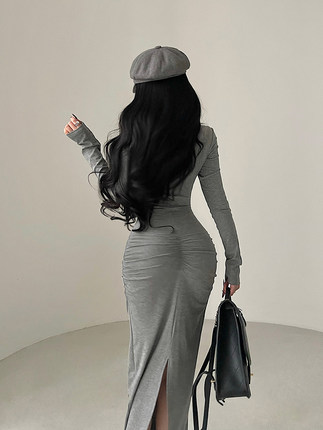 YoungGirlDay 纯欲性感U领修身显瘦褶皱长袖后开叉包臀连衣裙长裙