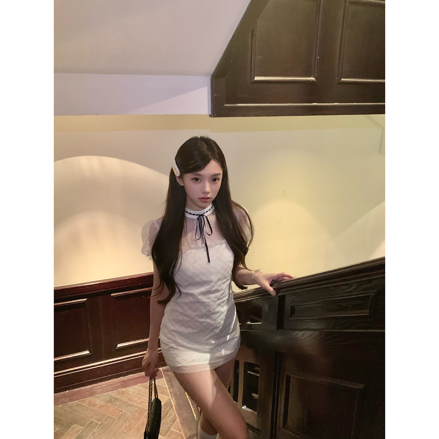 Le 19 RomanLand千金度假风泡泡袖植绒波点网纱拼接约会连衣裙