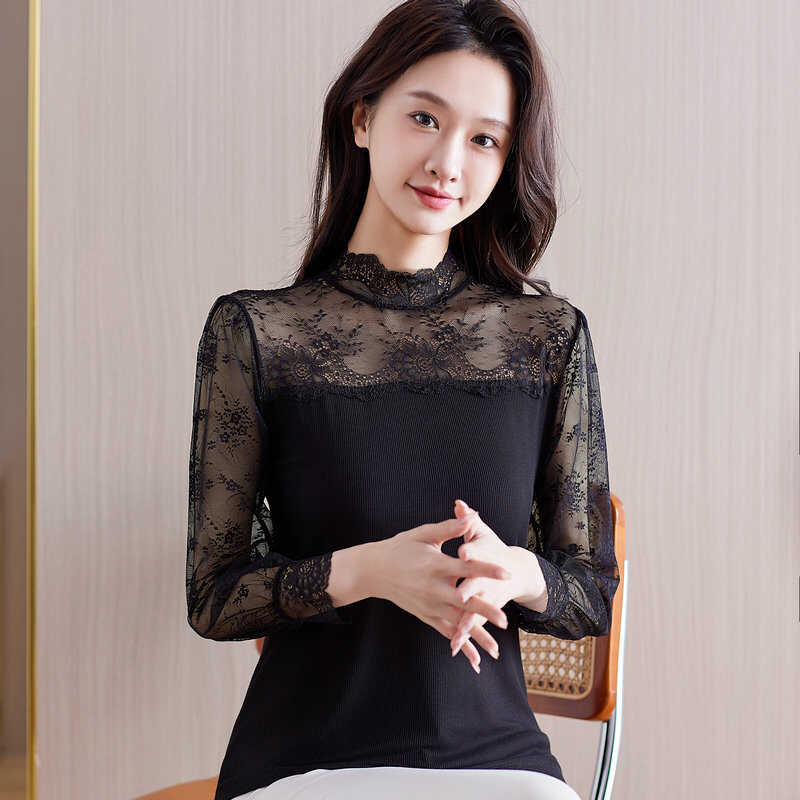 蕾丝打底衫女立领百搭上衣2025秋季镂空修身半高领内搭薄长袖小衫