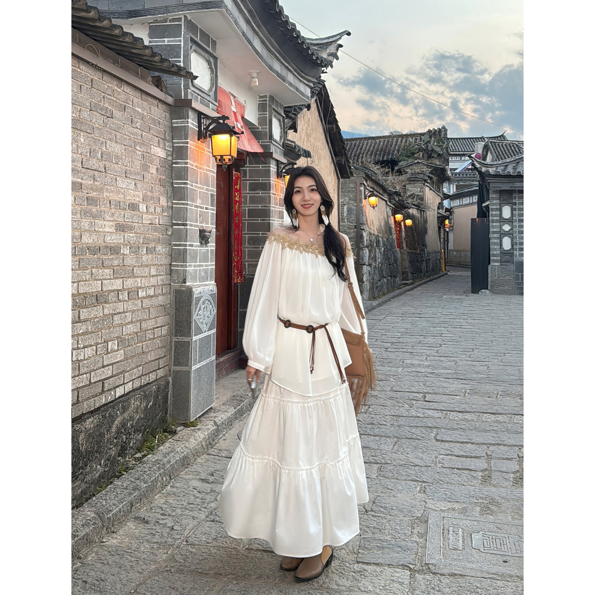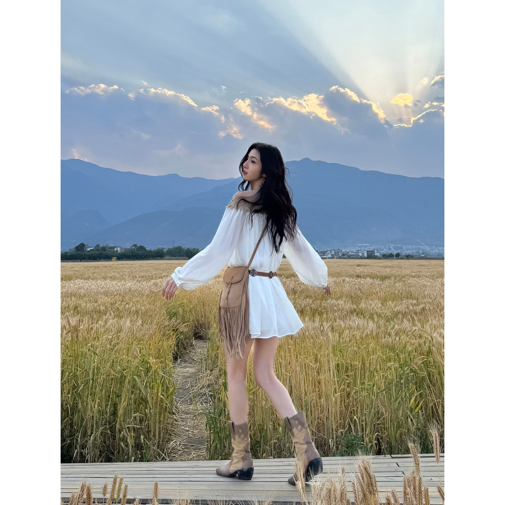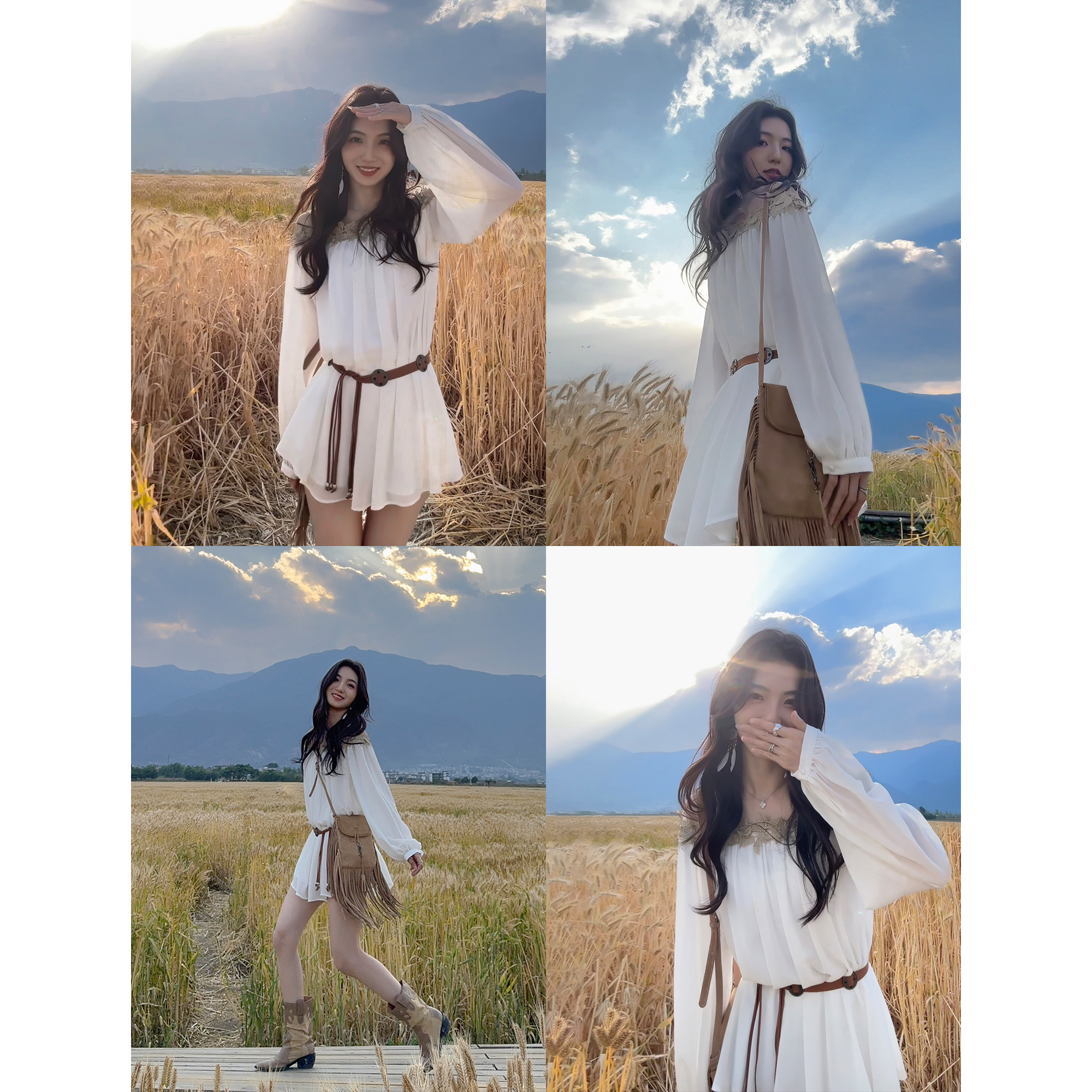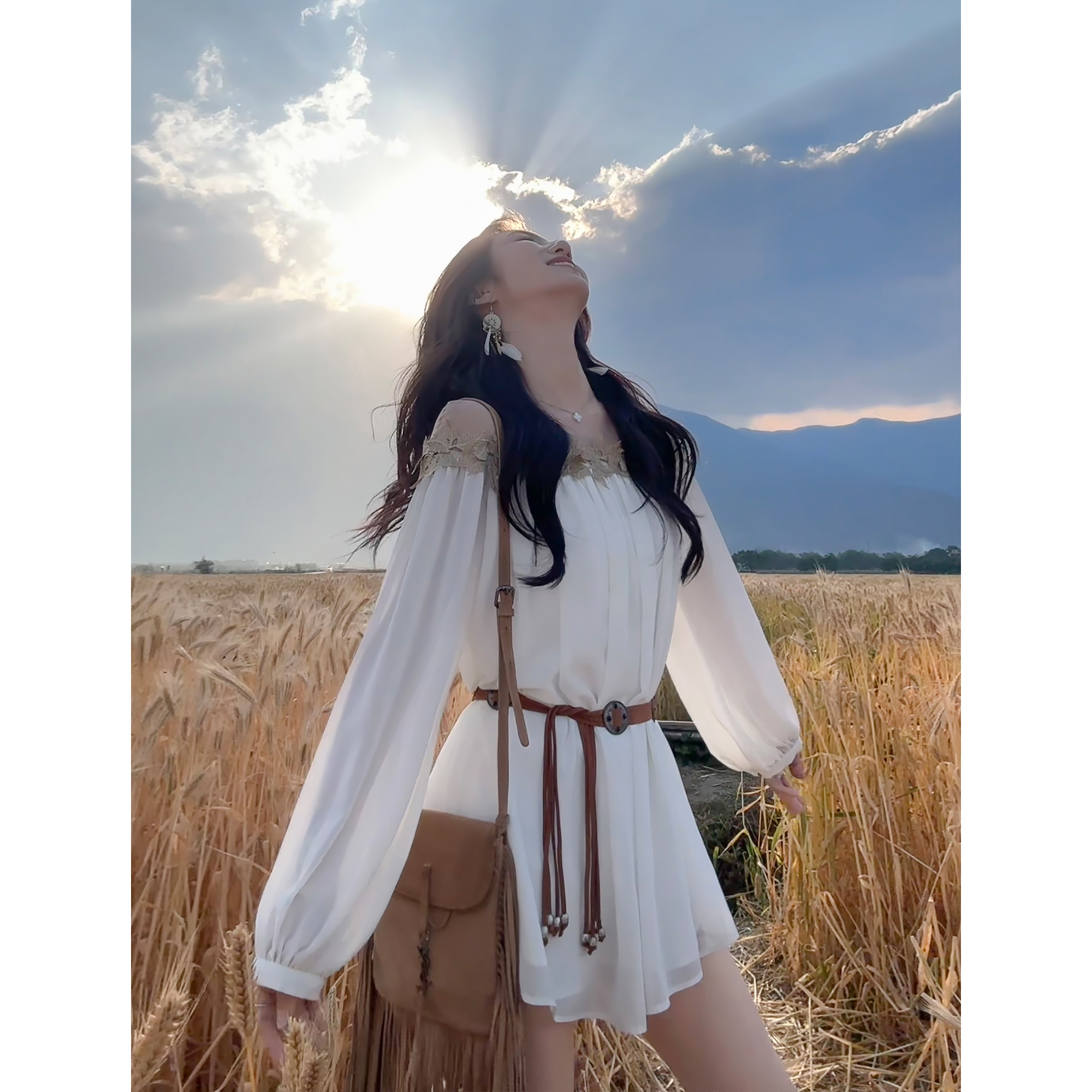 MULVAN 流动诗集 一字肩拼接长袖雪纺连衣裙女宽松温柔设计感短裙