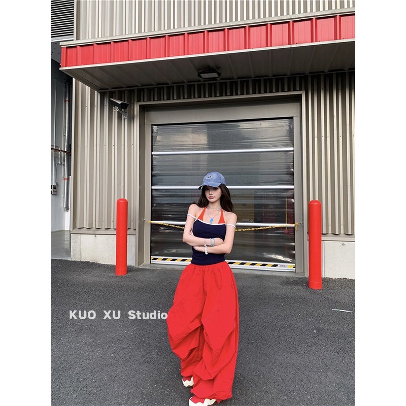 韩系绝美小套装撞色挂脖假两件吊带背心上衣红色高腰休闲阔腿裤女