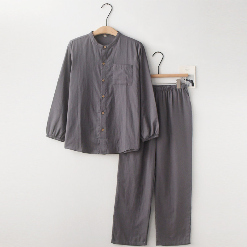 简约无印风睡衣男女春夏季纯棉纱布薄款大码长袖情侣家居服套装