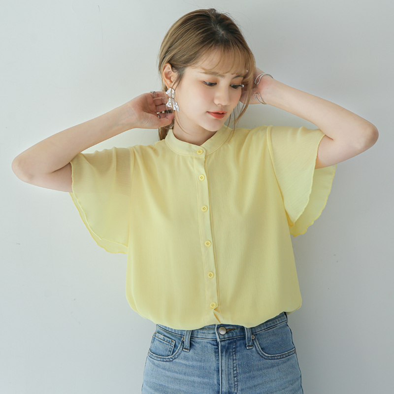 春夏新款衬衣文艺宽松休闲百搭立领纯色荷叶边短袖衬衣女士雪纺衫