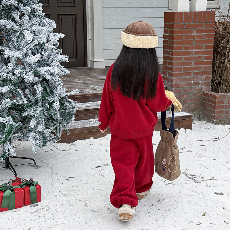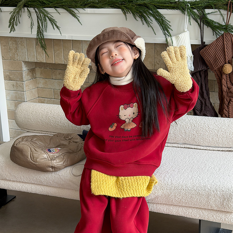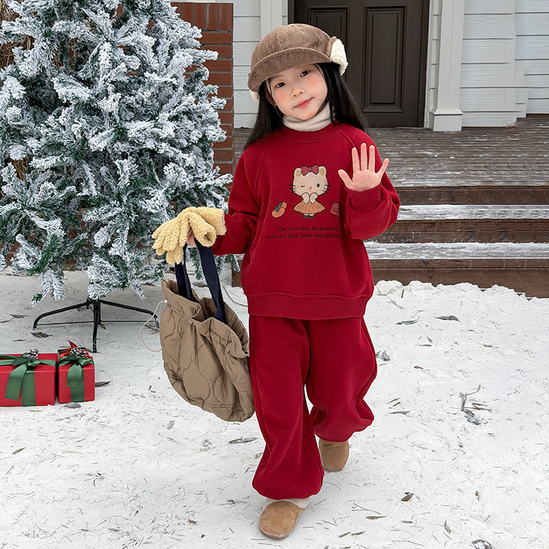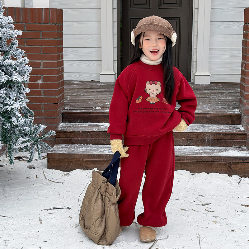 依依妈女童冬季可爱猫咪卫衣套装儿童加厚加绒卫裤韩版上衣两件潮