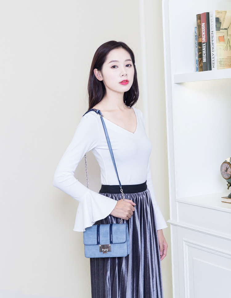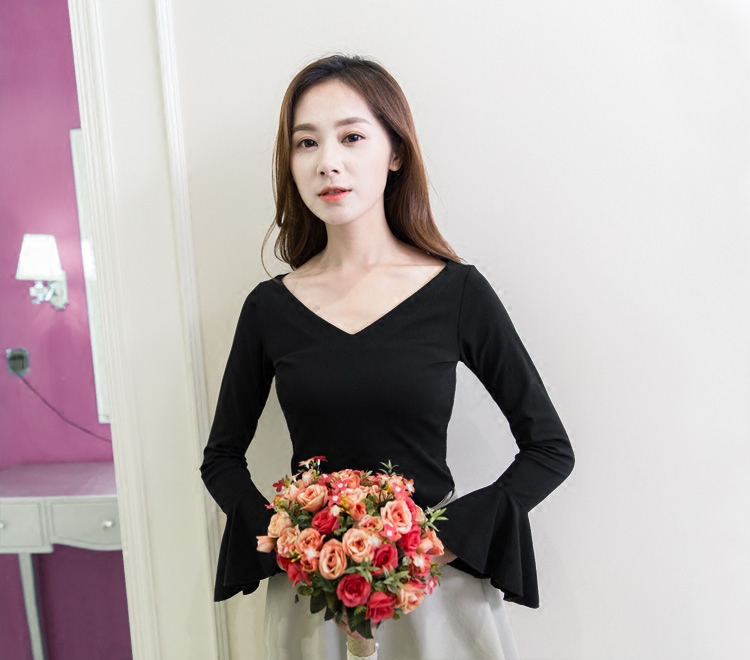 春装长袖纯色棉质修身喇叭袖T恤女V领紧身针织上衣显瘦打底衫黑色