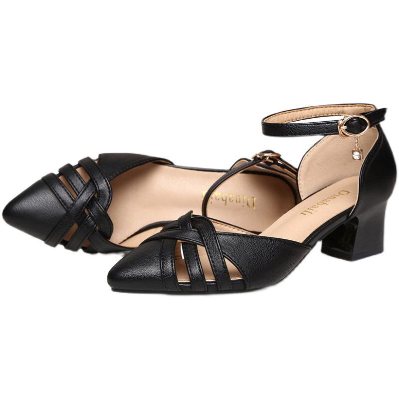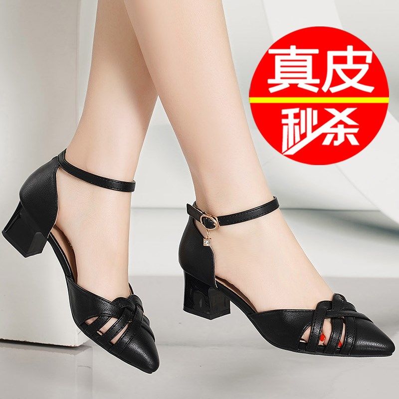 舒适软底真皮中跟包头黑色凉鞋夏季女款粗跟时尚配裙子妈妈高跟
