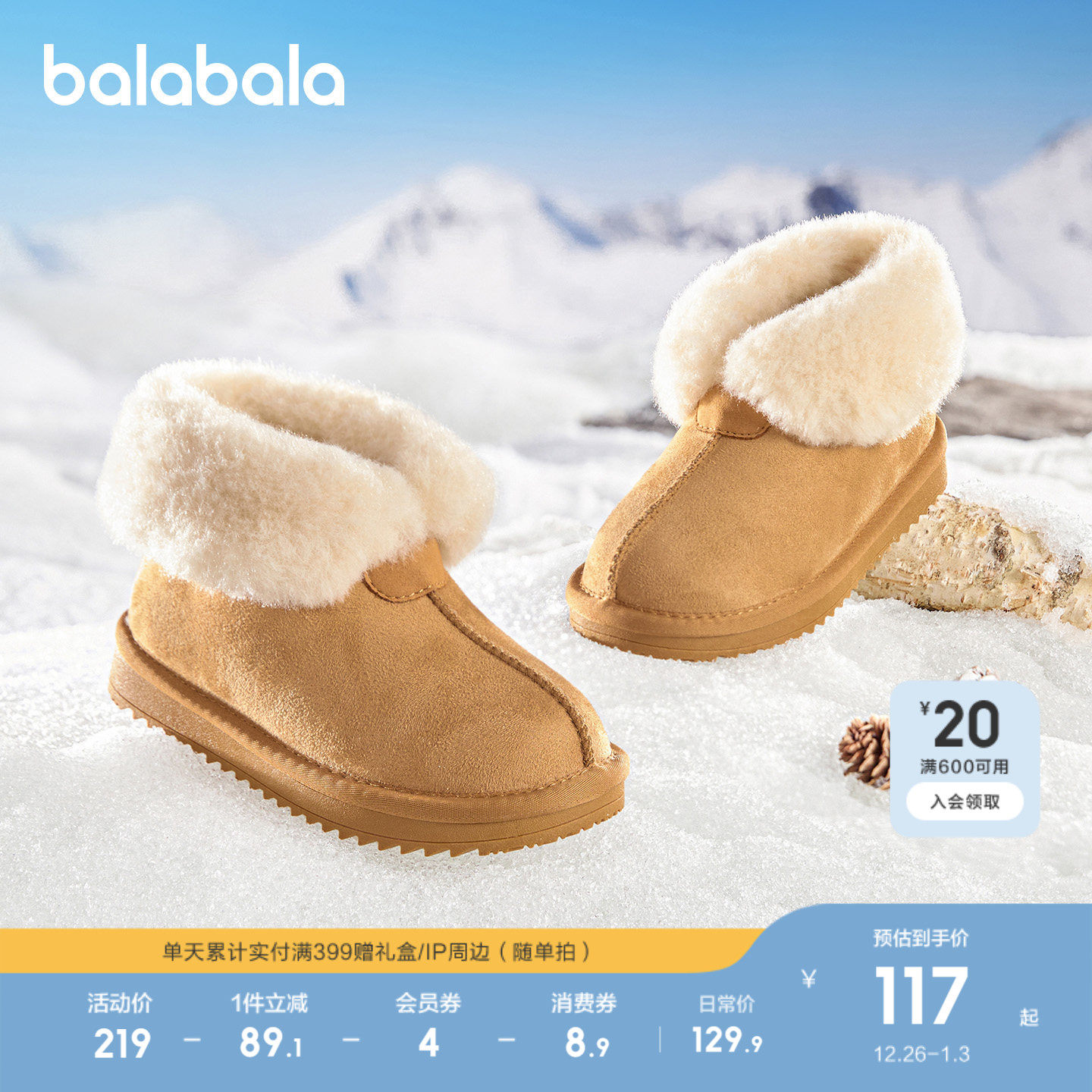 巴拉巴拉童鞋儿童雪地靴男女童短靴加厚加绒2025新冬靴子保暖棉鞋