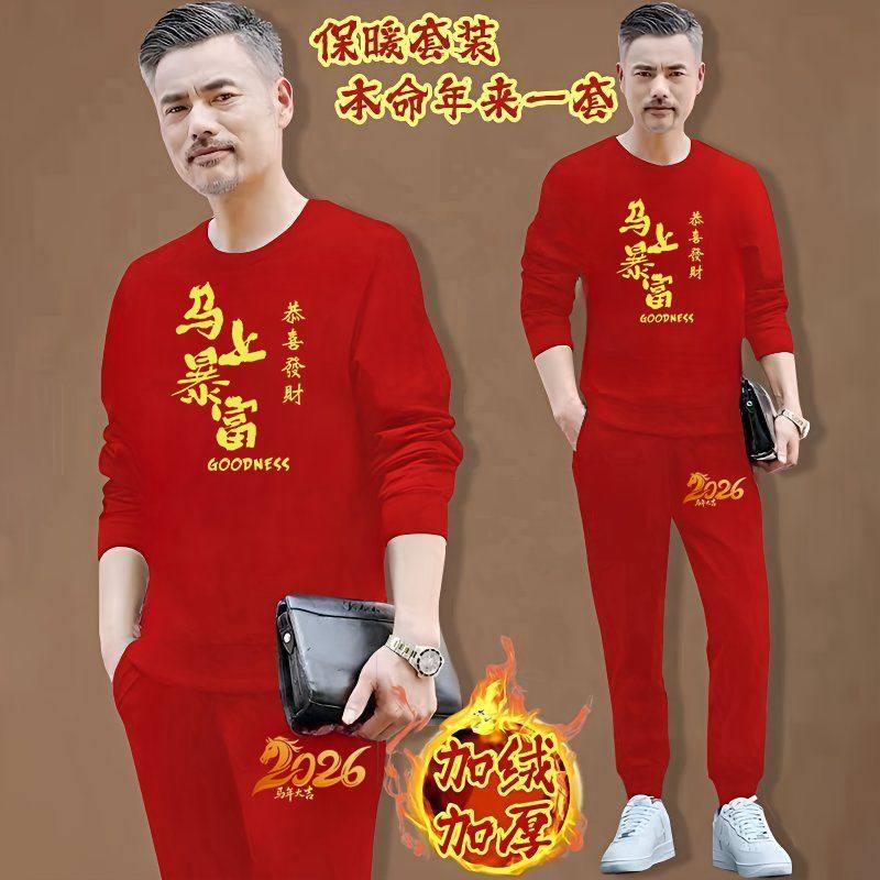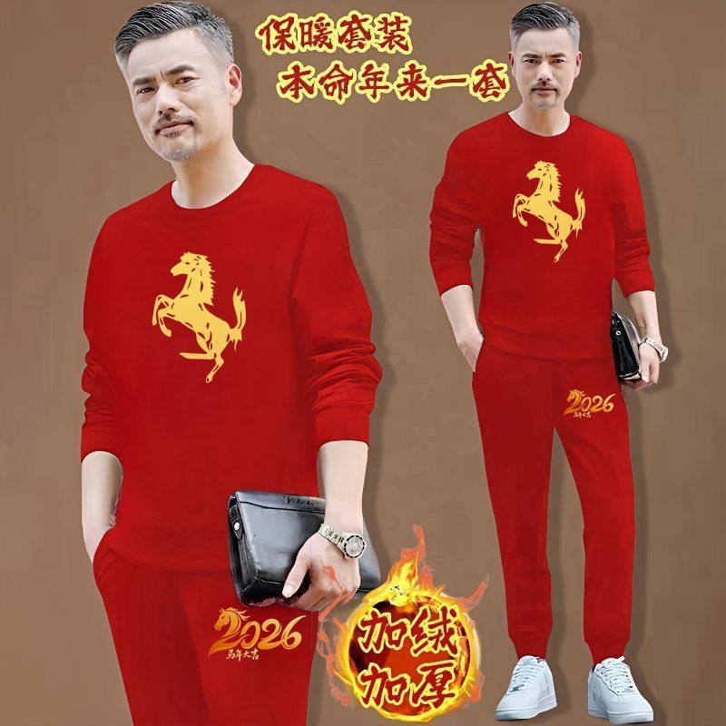 马年男士本命年冬季双面发热德绒秋衣加秋裤保暖内衣红色套装加绒