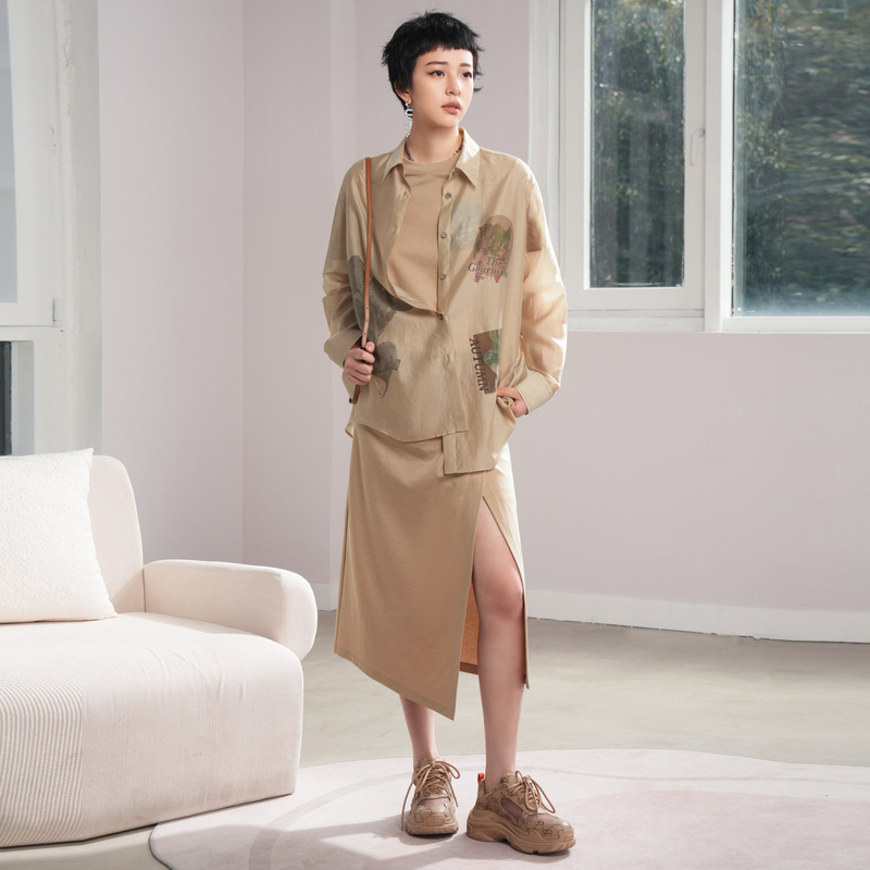 U/TI卡其色一片式开衩半裙女醋酸亲肤简约半身裙尤缇时尚秋季新款