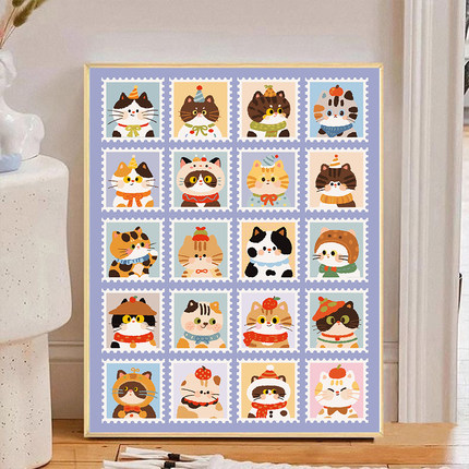 宝藏湾 数字油画diy猫咪邮票可爱治愈填色多色填充数字画独家画