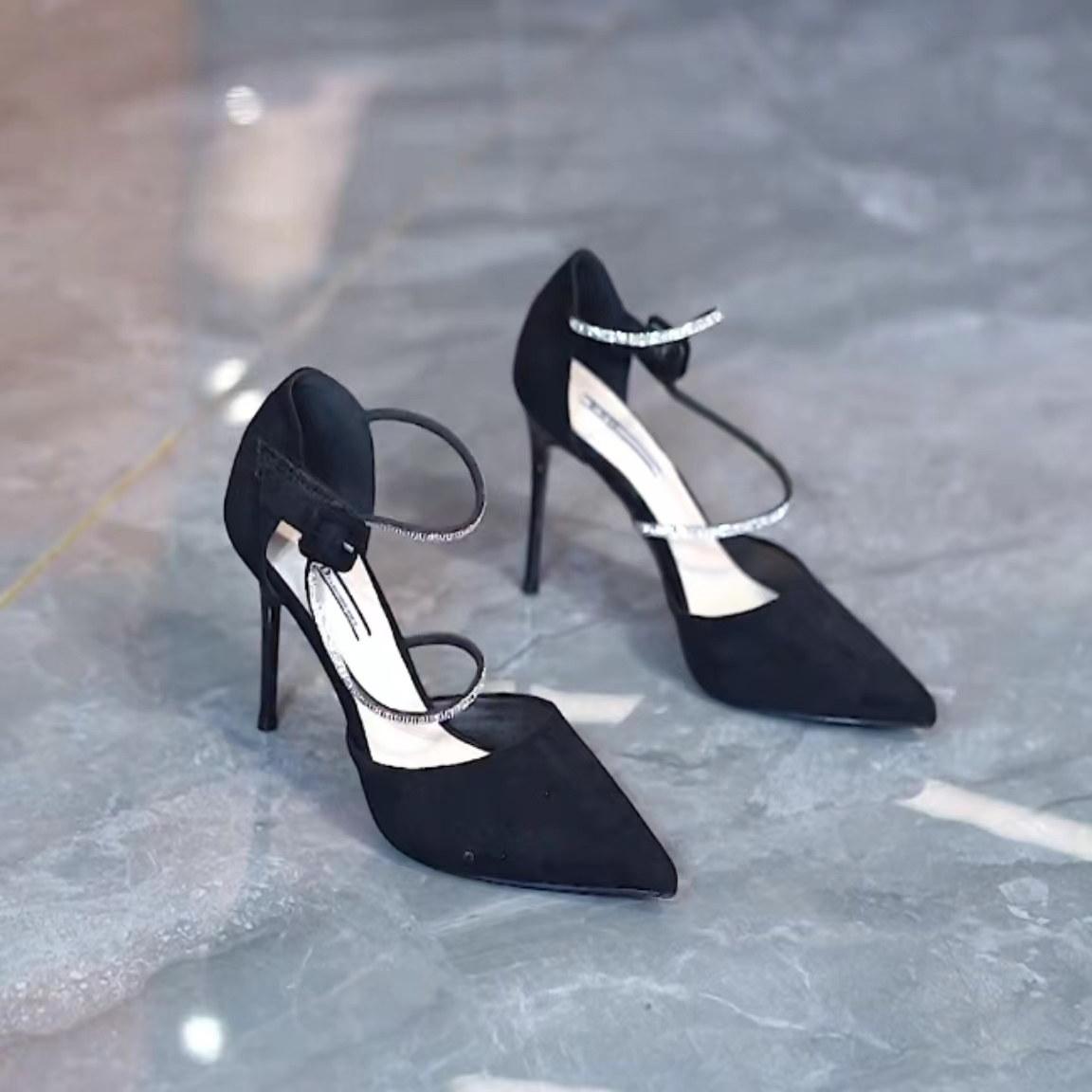 绒面显瘦性感单鞋女2025年夏季新款宴会尖头水钻魔术贴细跟高跟鞋