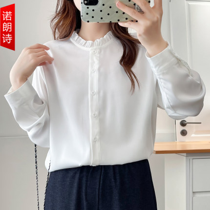 大码女装2025秋装新款简约设计感木耳边花边领长袖衬衫胖mm雪纺衫