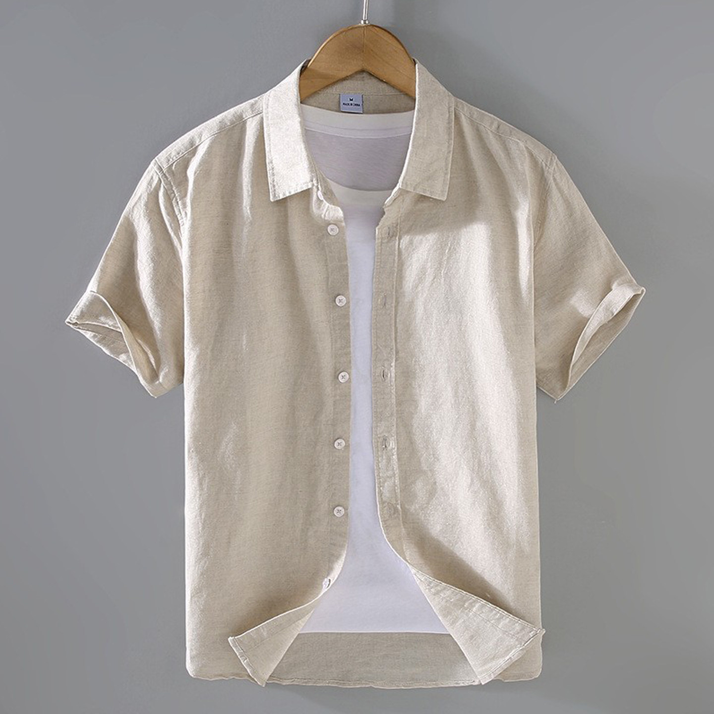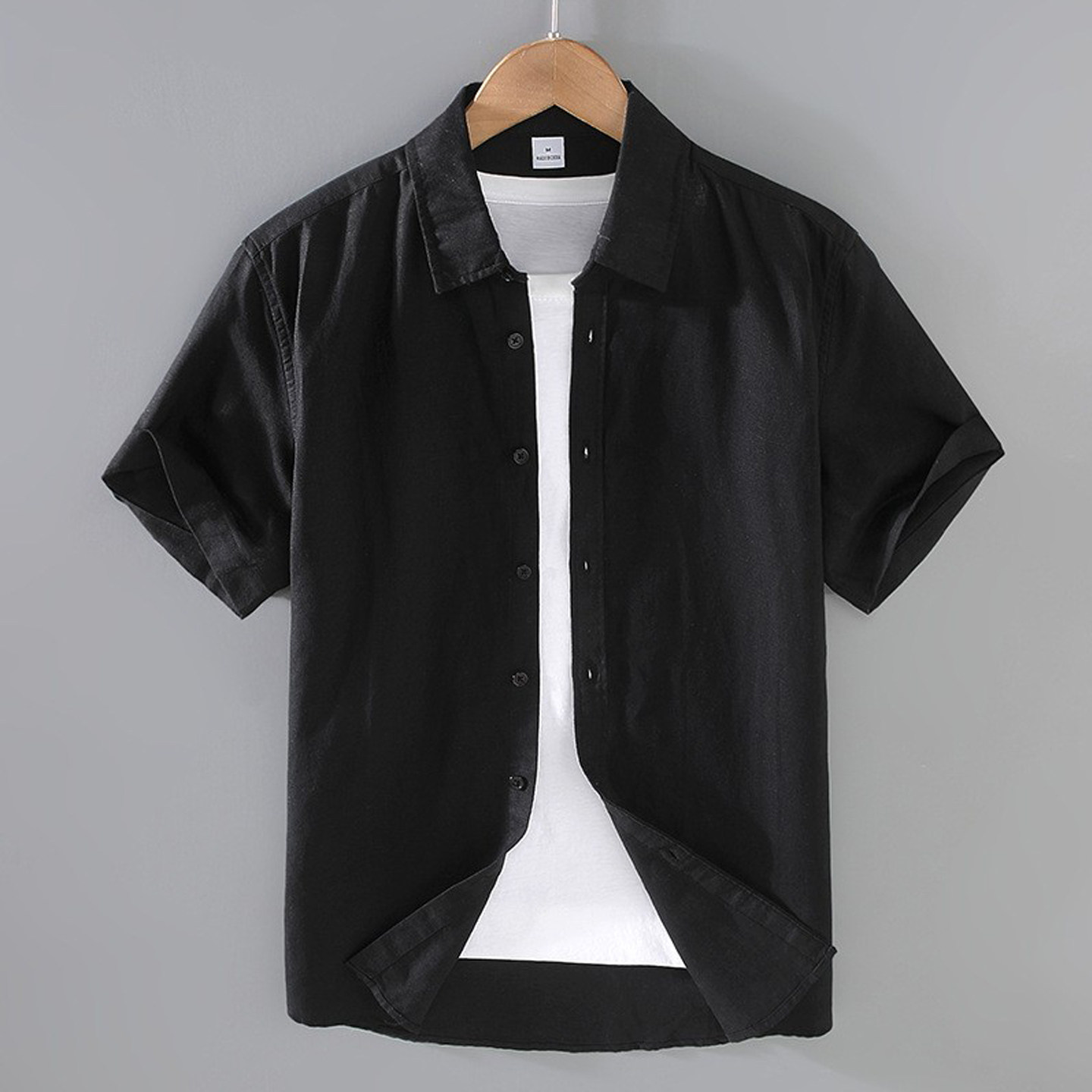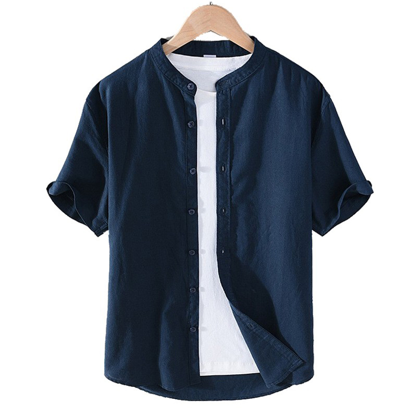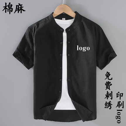 棉麻复古衬衫定制立领短袖休闲夏季宽松工作服亚麻咖啡店刺绣logo