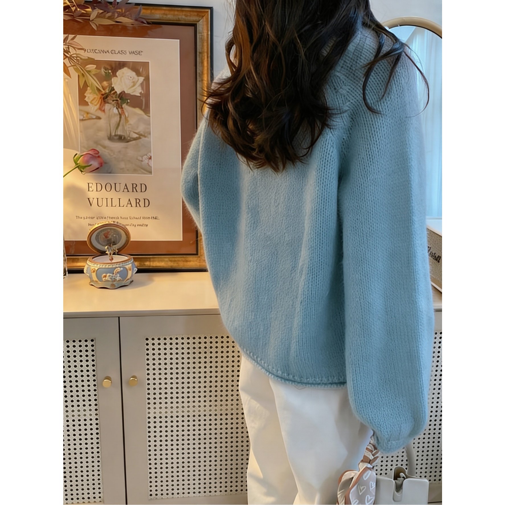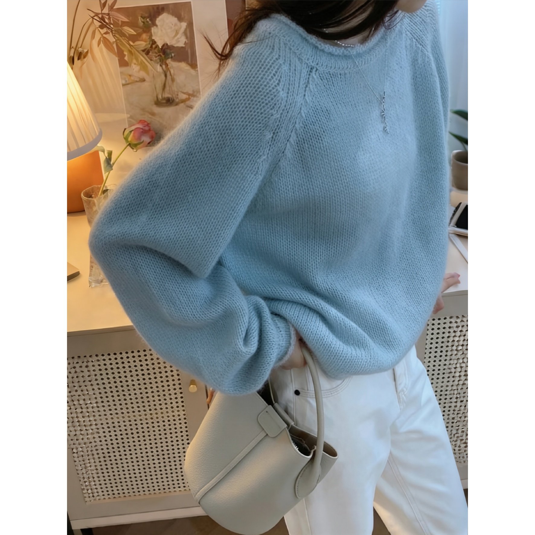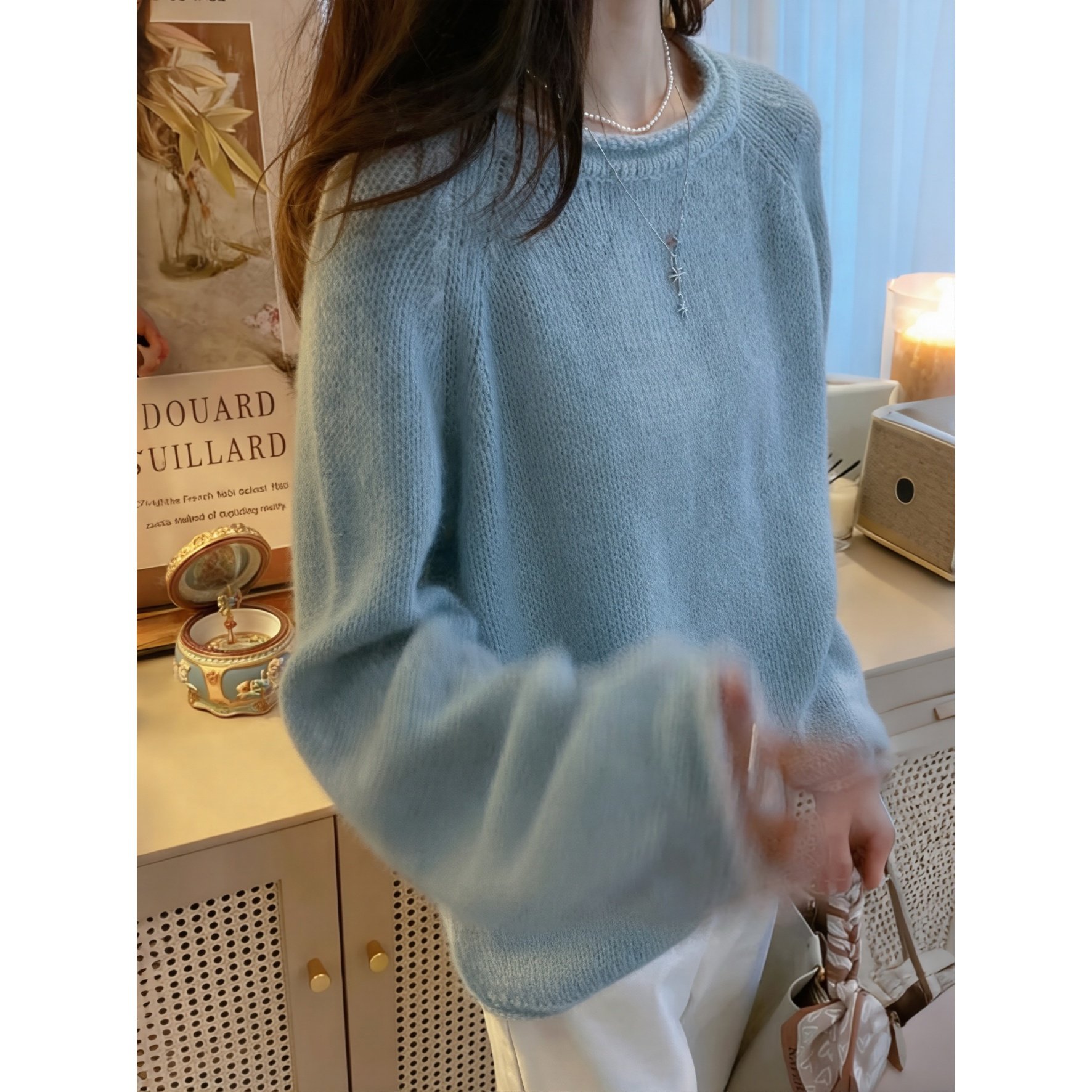 100%纯棉慵懒风圆领套头毛衣女宽松显瘦针织打底衫温柔风蓝色上衣