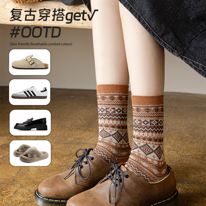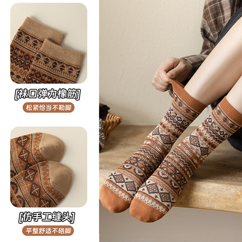 袜子女士秋冬双针中筒棉袜堆堆复古民族风ins咖潮美长袜条纹黑色