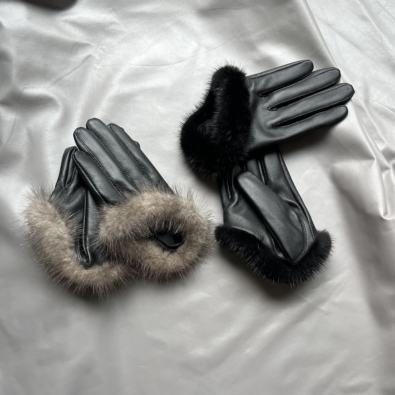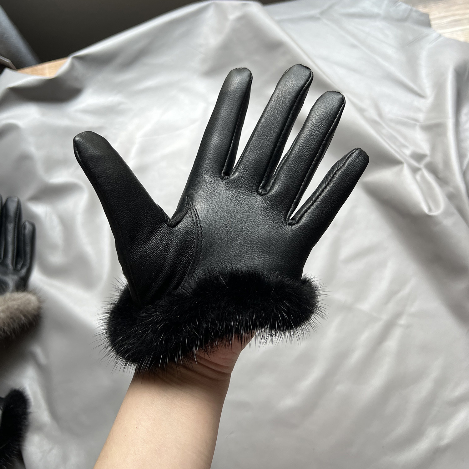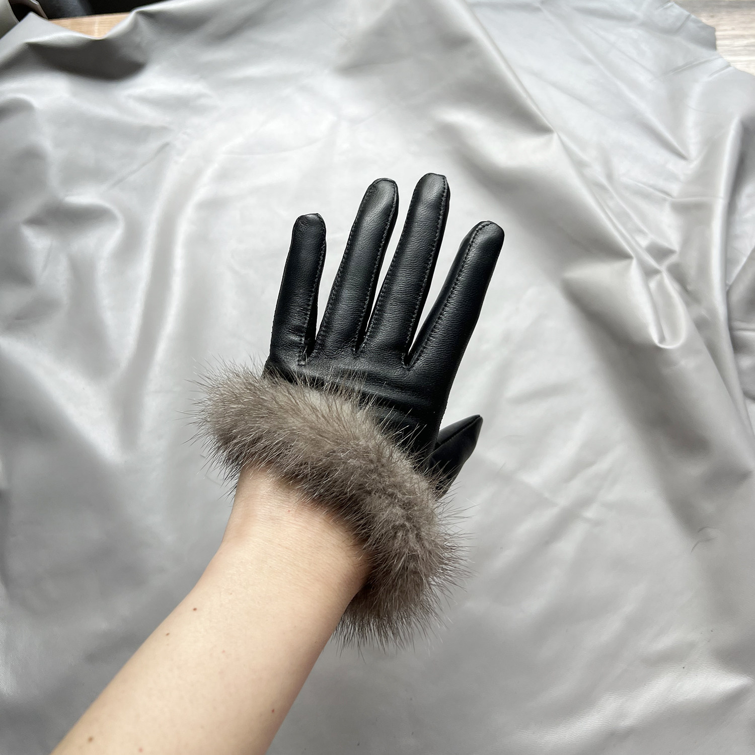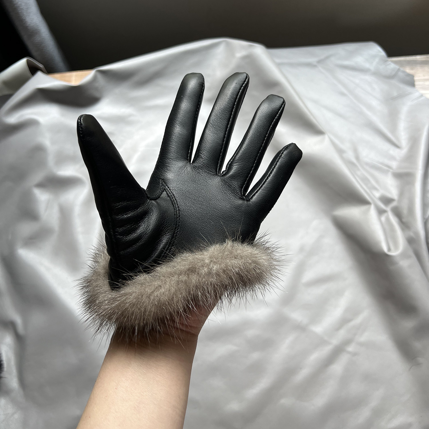 新品女士羊皮手套真皮水貂毛皮手套触屏薄里黑灰色时尚杂志款开车