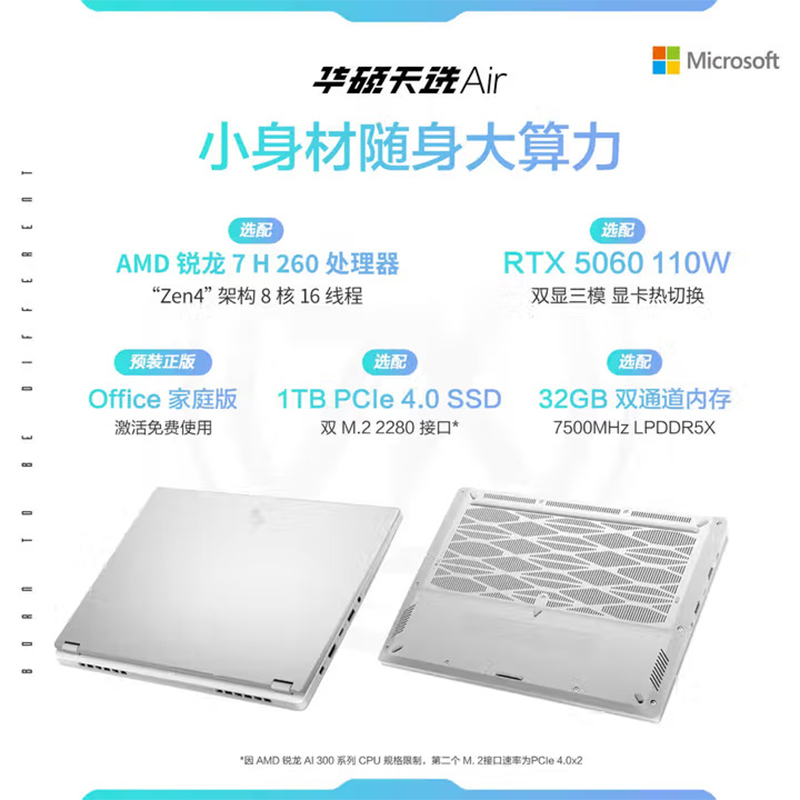 【自营】华硕天选Air 2025 锐龙7 H260 RTX5060显卡14英寸全能轻薄游戏本学生设计办公笔记本电脑