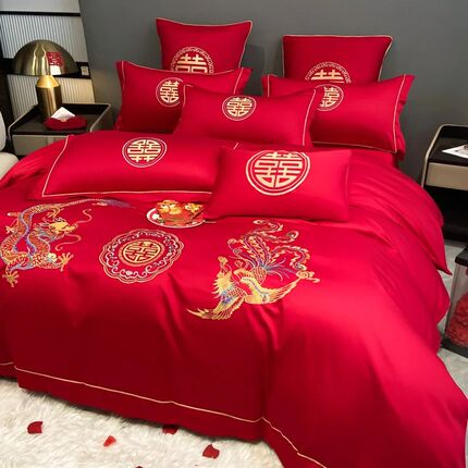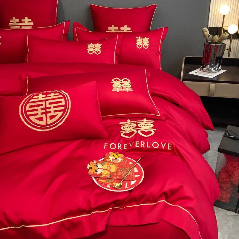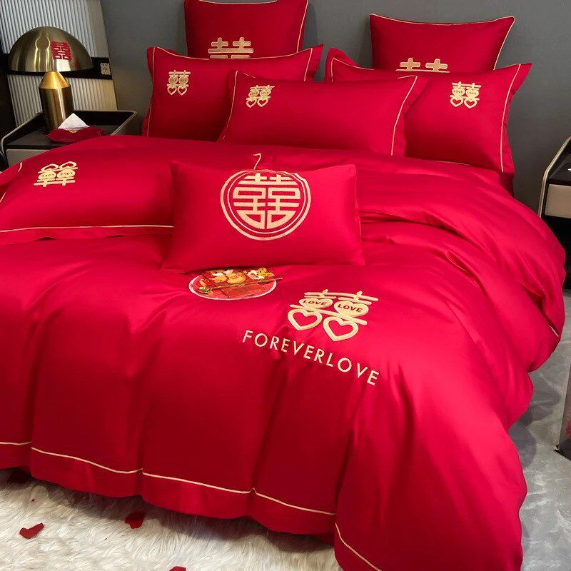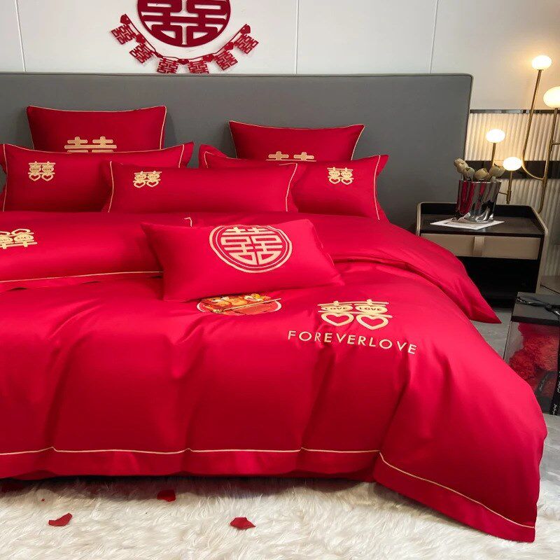 结婚床上用品四件套婚庆红色婚房喜被床单被套被单婚礼大红色新婚
