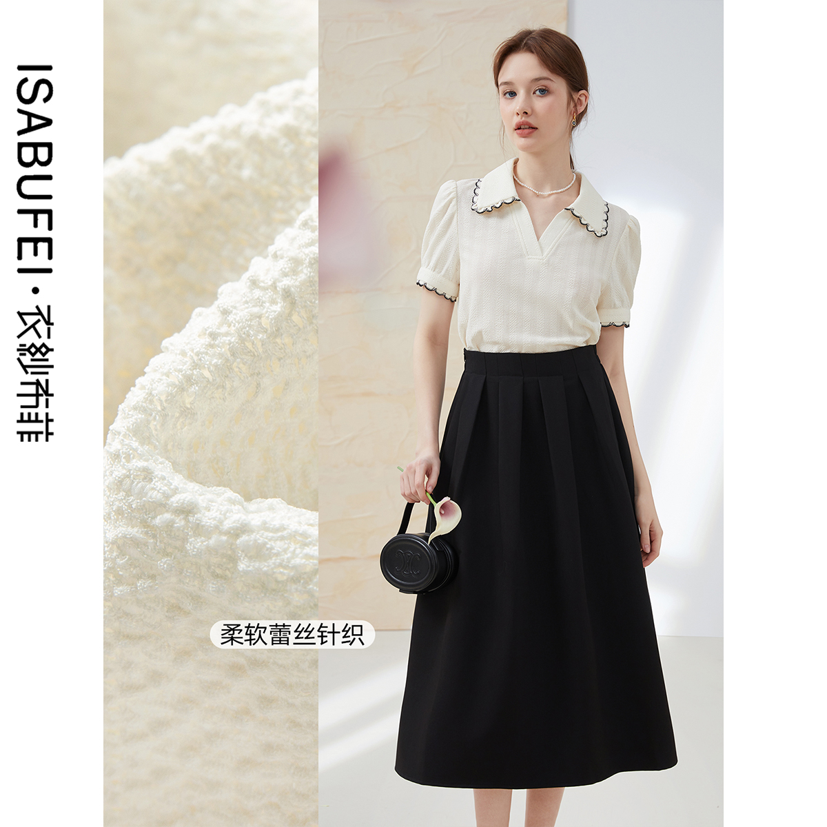 衣纱布菲织韵 温柔蕾丝针织短袖t恤女夏装泡泡袖休闲上衣