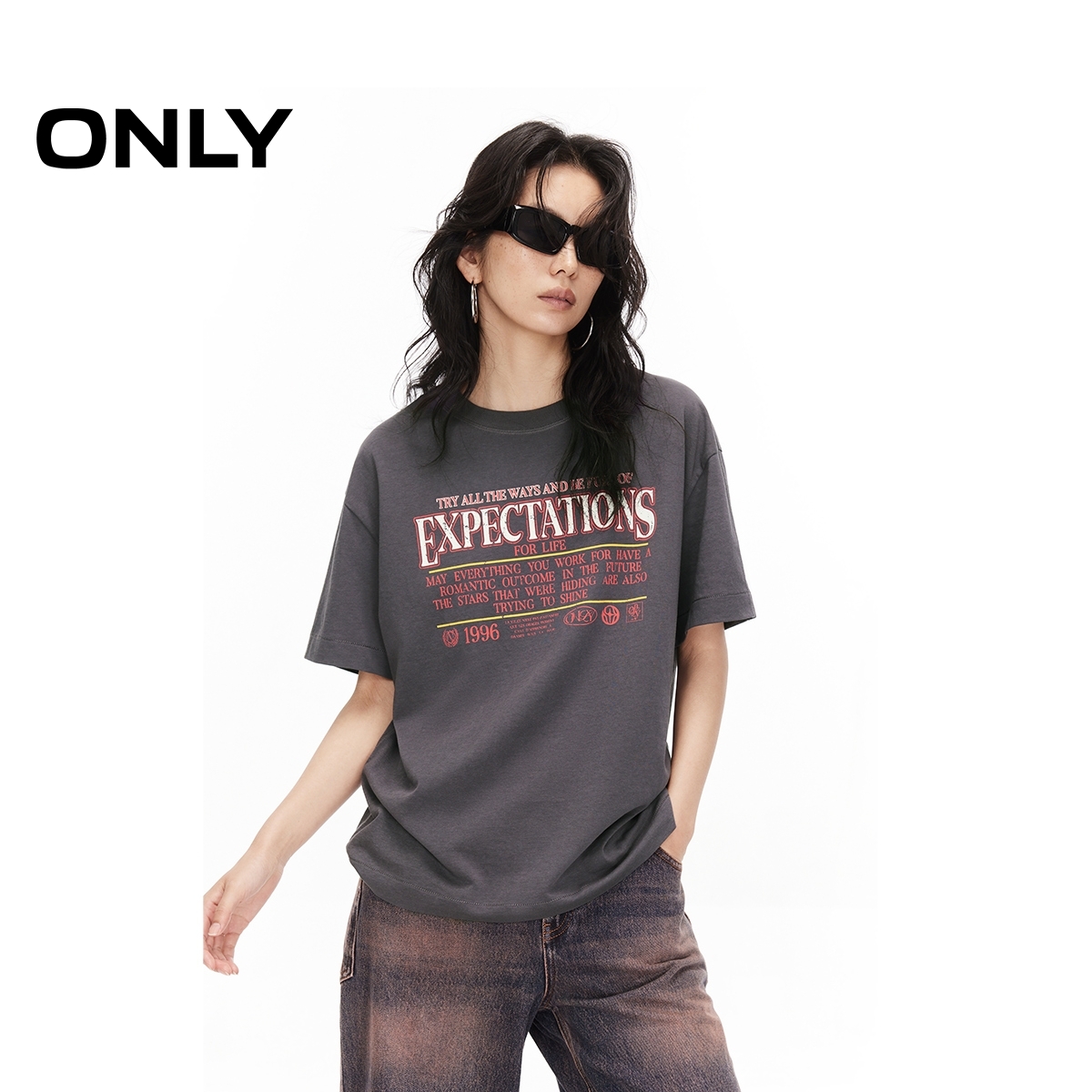ONLY2025夏季新款字母印花设计宽松显瘦落肩休闲圆领短袖T恤女