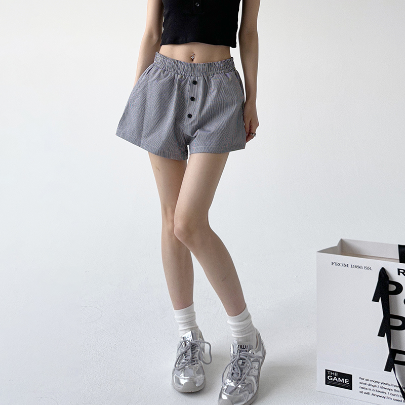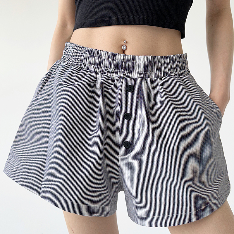 夏季复简约竖条纹短裤女2024新款宽松阔腿裤松紧腰a字黑色休闲裤