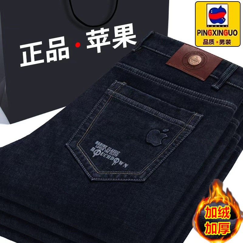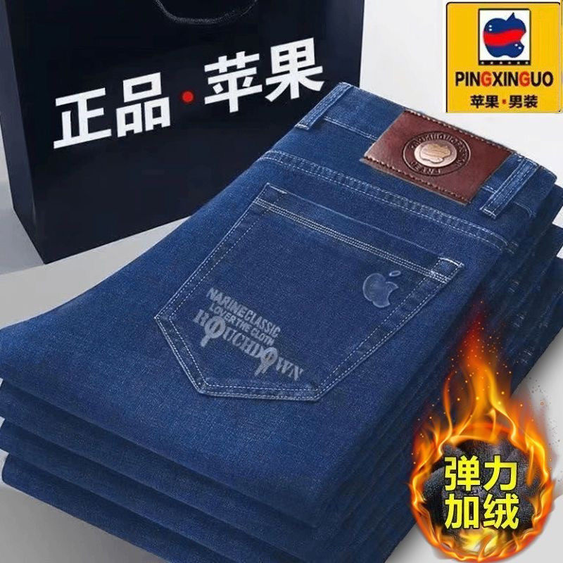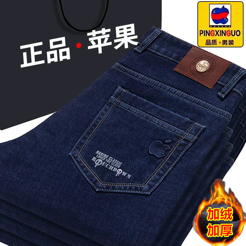 正品苹果加绒加厚牛仔裤男直筒宽松高腰弹力商务休闲保暖长裤子男