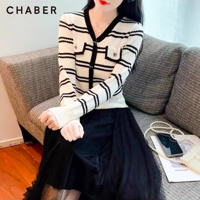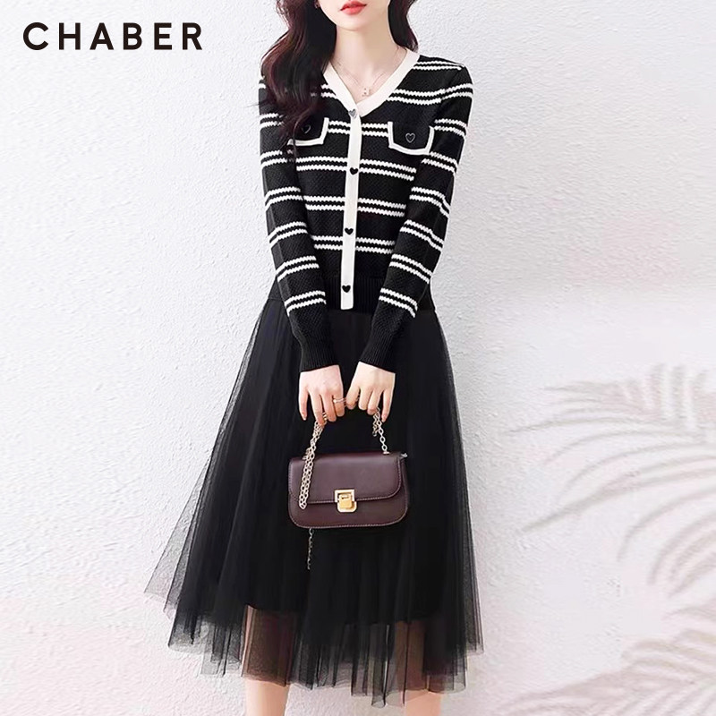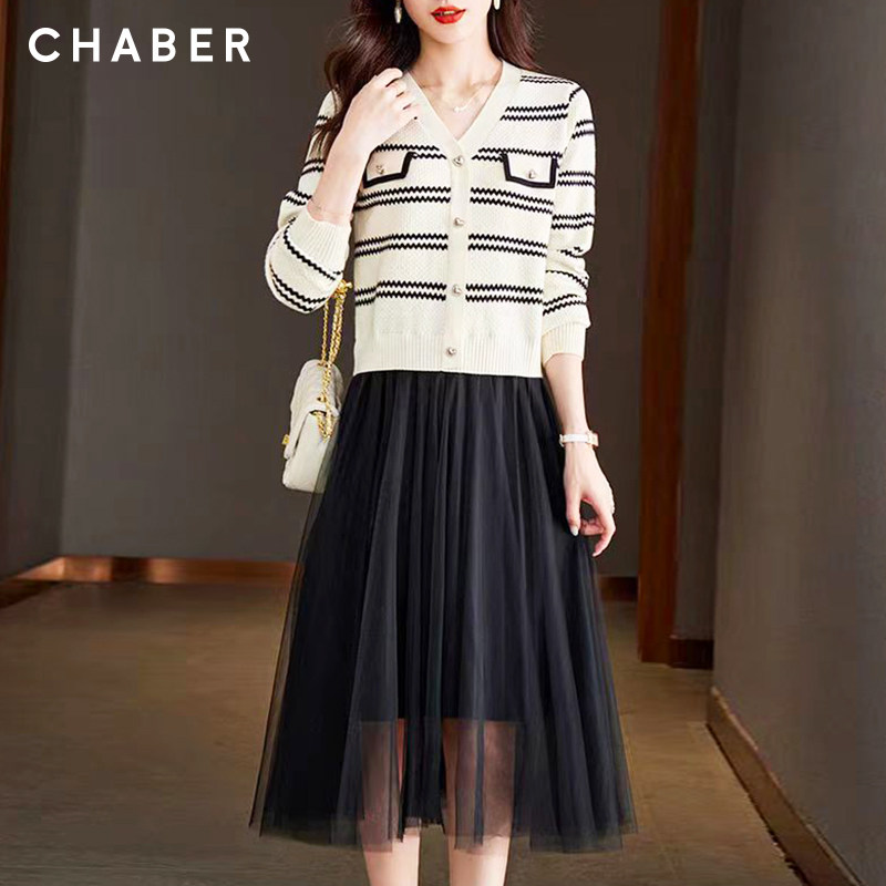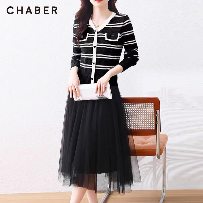 chaber巧帛春季上新网纱拼接针织裙中长款时尚气质显瘦A字连衣裙