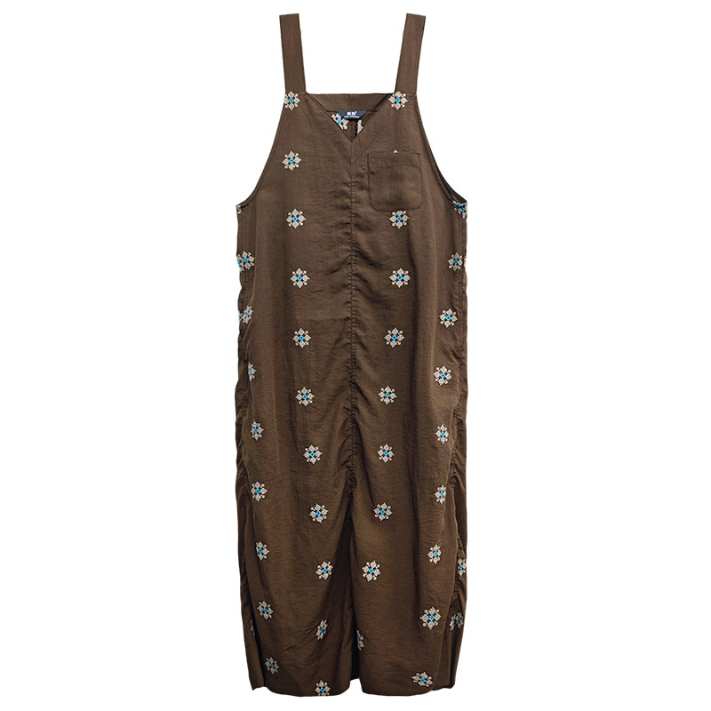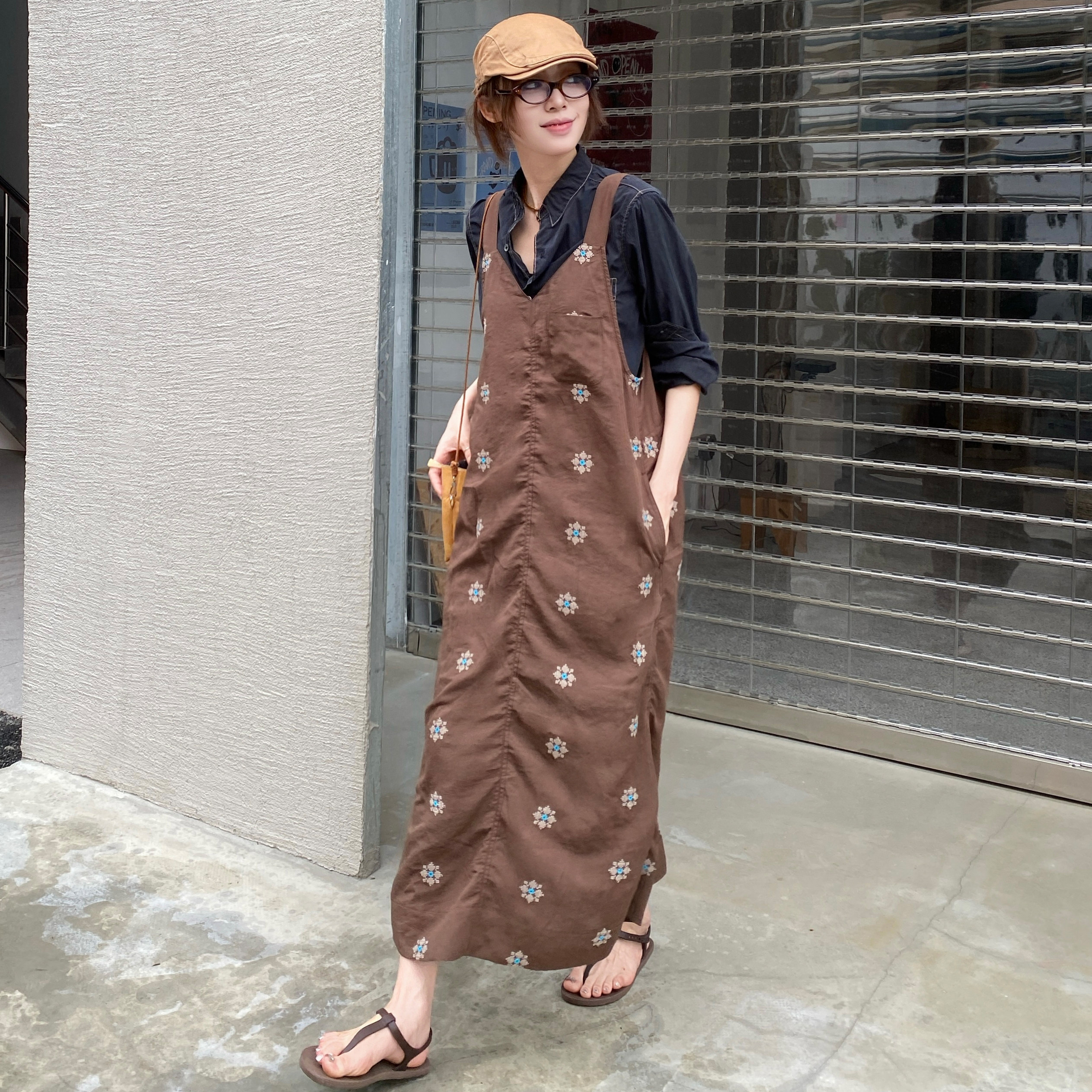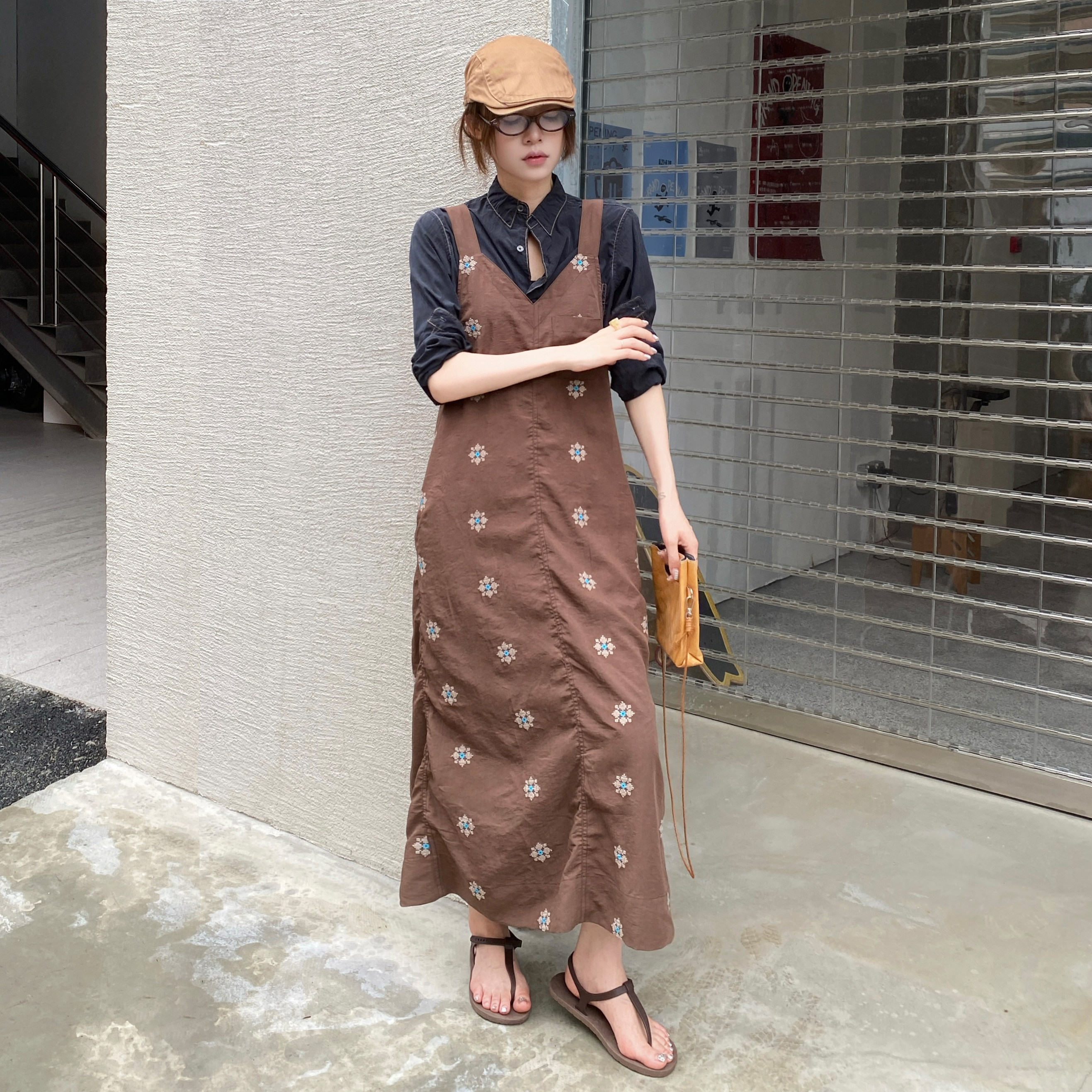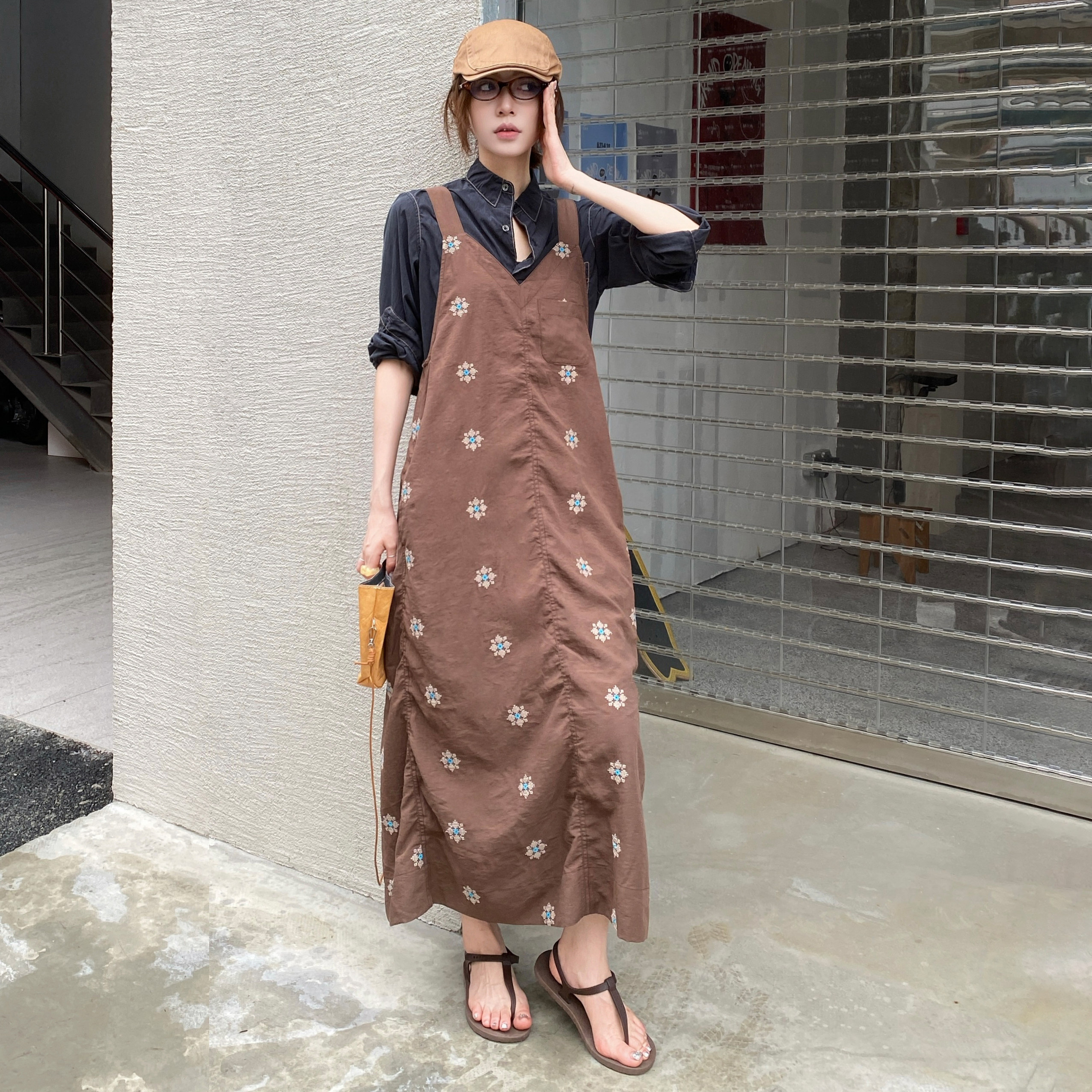 画粉原创刺绣抽褶背带连衣裙新款小众设计感直筒显瘦休闲背带长裙