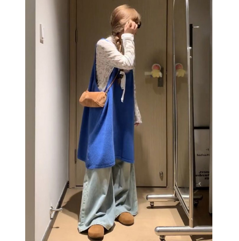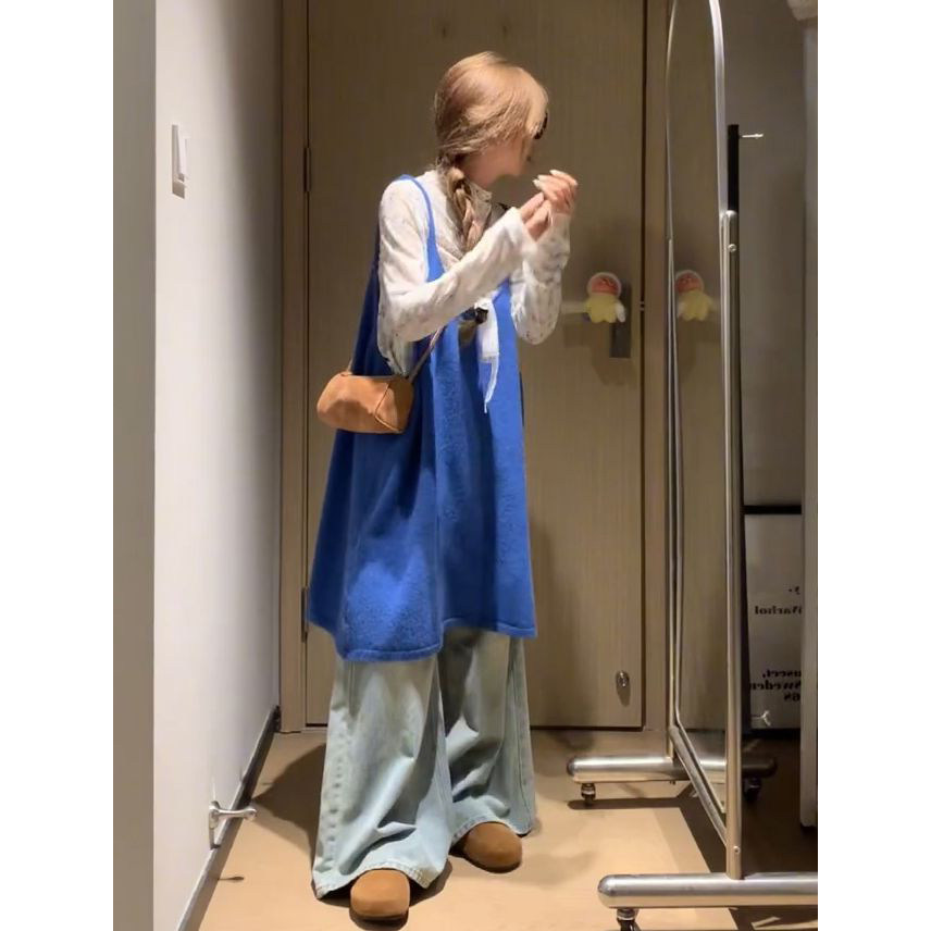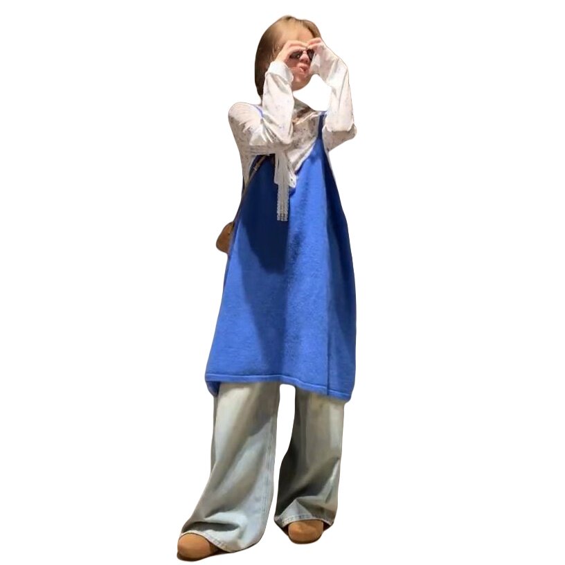 时尚一整套穿搭甜美宽松蓝色针织背带马甲背心裙简约碎花打底上衣