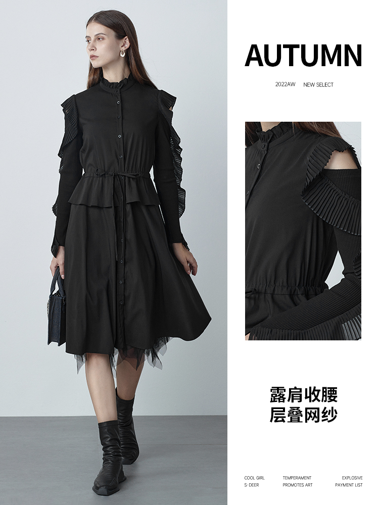 sdeer圣迪奥女春秋装收腰网纱风琴褶拼接衬衫连衣裙S221Z1267