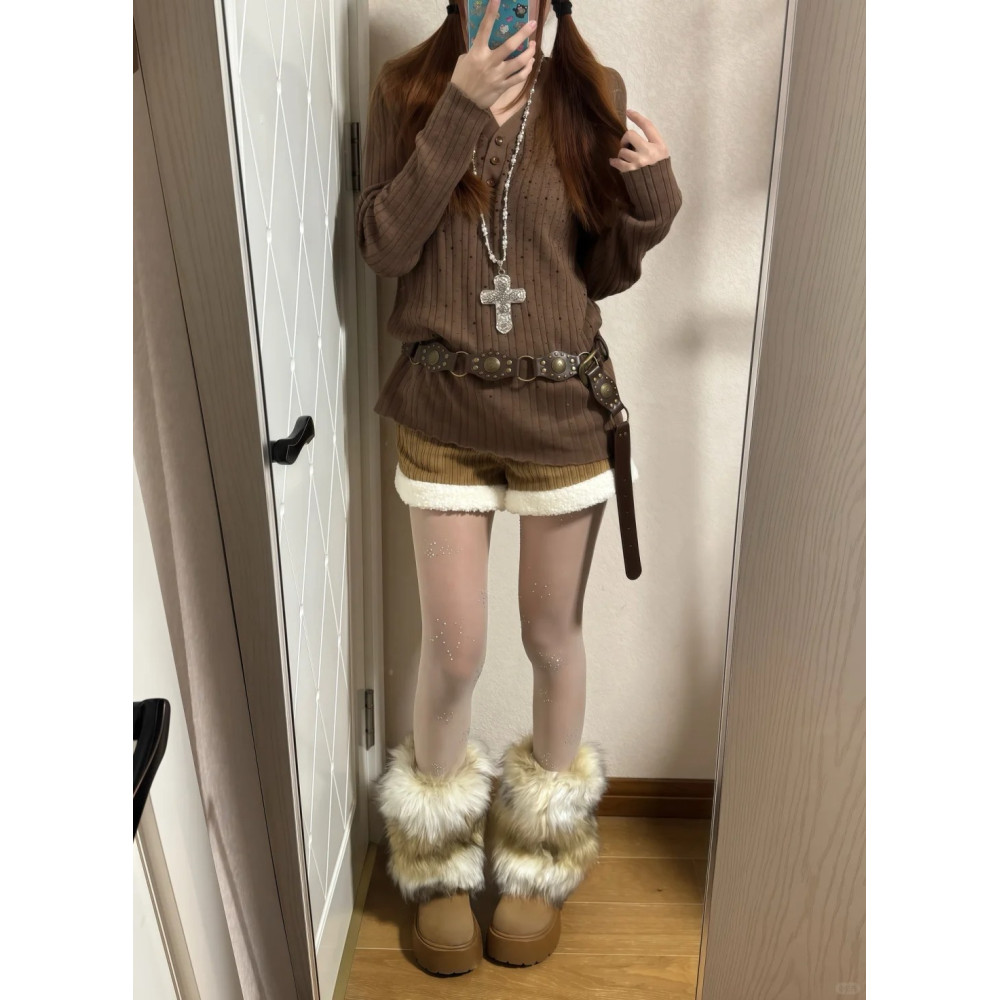 大码胖mm美式复古毛毛拼接灯芯绒休闲短裤女春季街头撞色显瘦靴裤