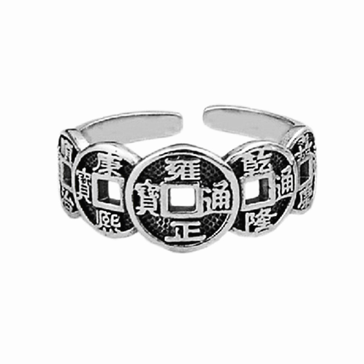时尚五帝钱开口戒指指环 民族风男女五个铜钱戒子招财手饰