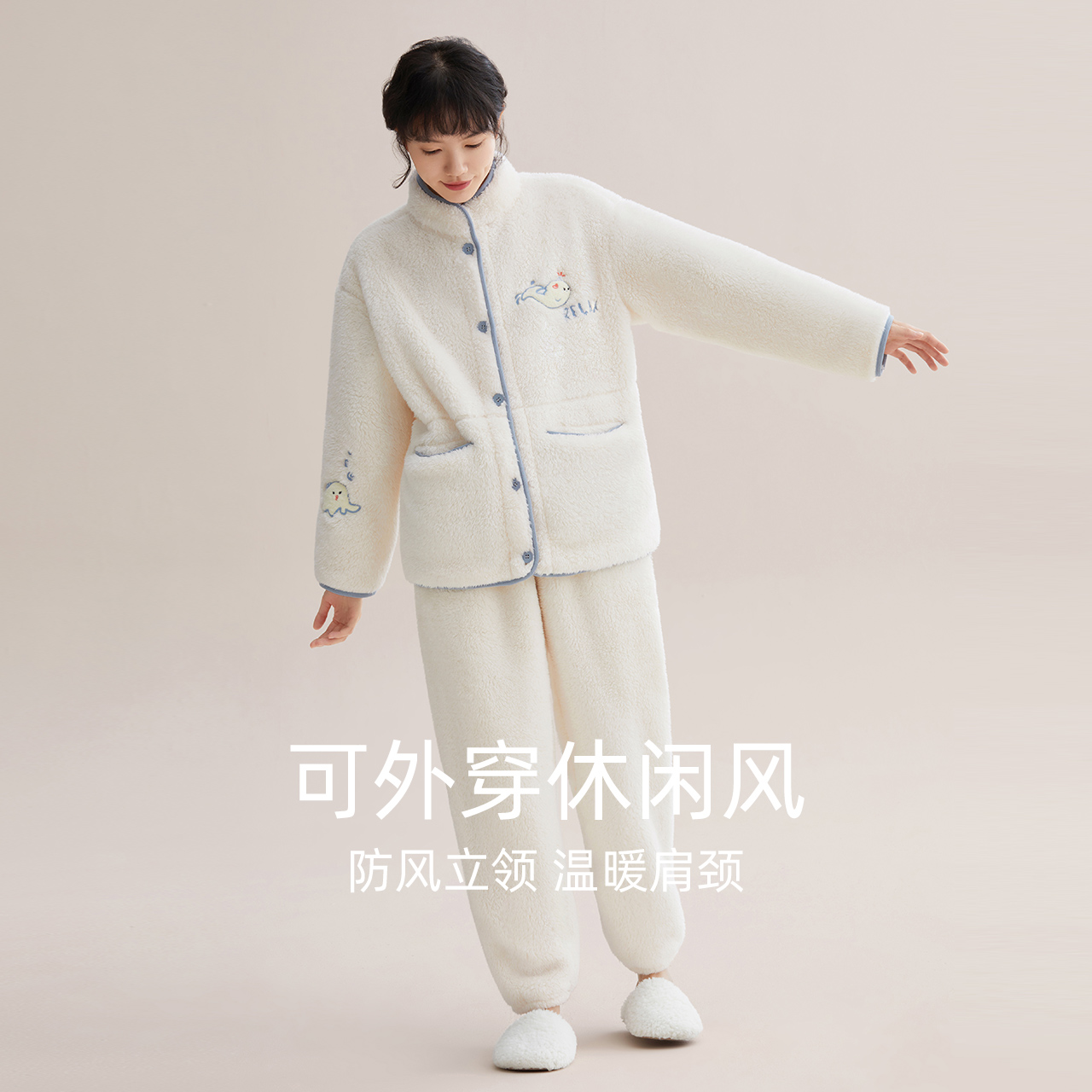 红豆居家暖暖绒情侣睡衣珊瑚绒法兰绒立领加厚家居服女可外穿秋冬