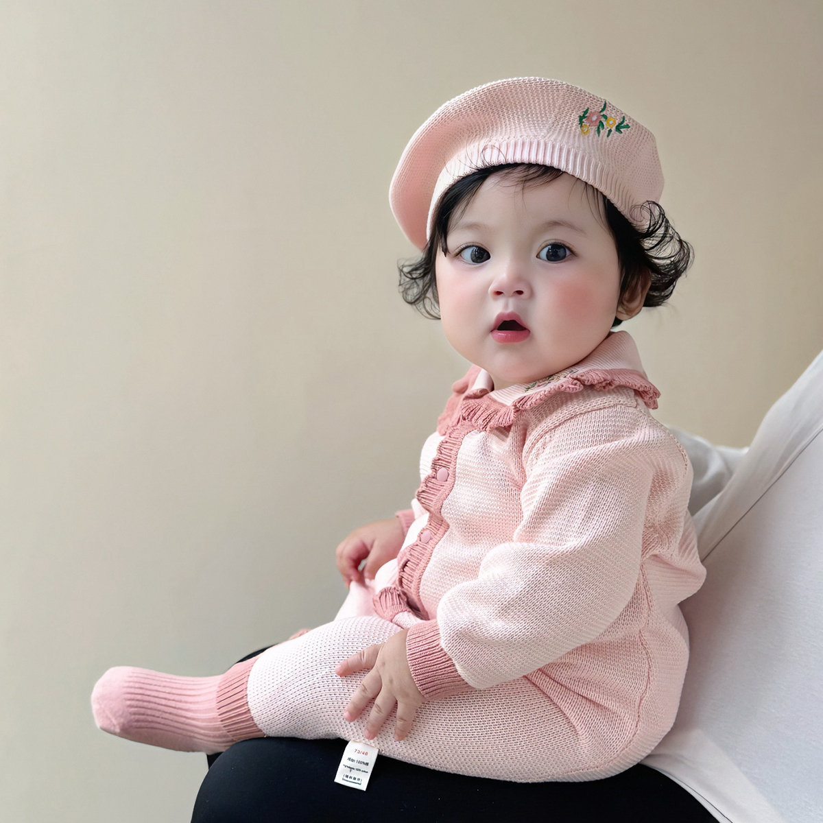 拉果拉贝贝园女婴粉色针织毛衣连体衣贝雷帽套装棉纱亲肤宝宝爬服