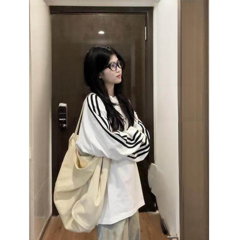 美式复古潮牌三条杠长袖T恤女春秋冬内搭打底衫chic宽松慵懒上衣