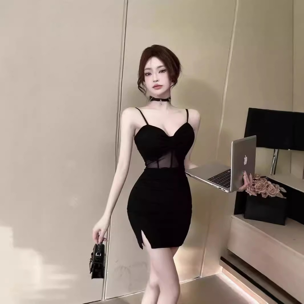 夏季新款欧美百搭修身连衣裙性感露背开叉紧身包臀吊带短裙女