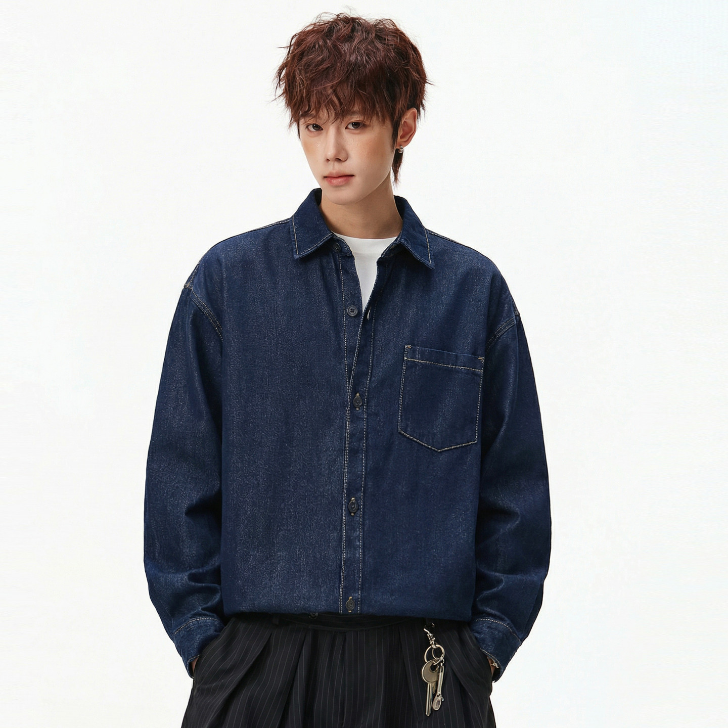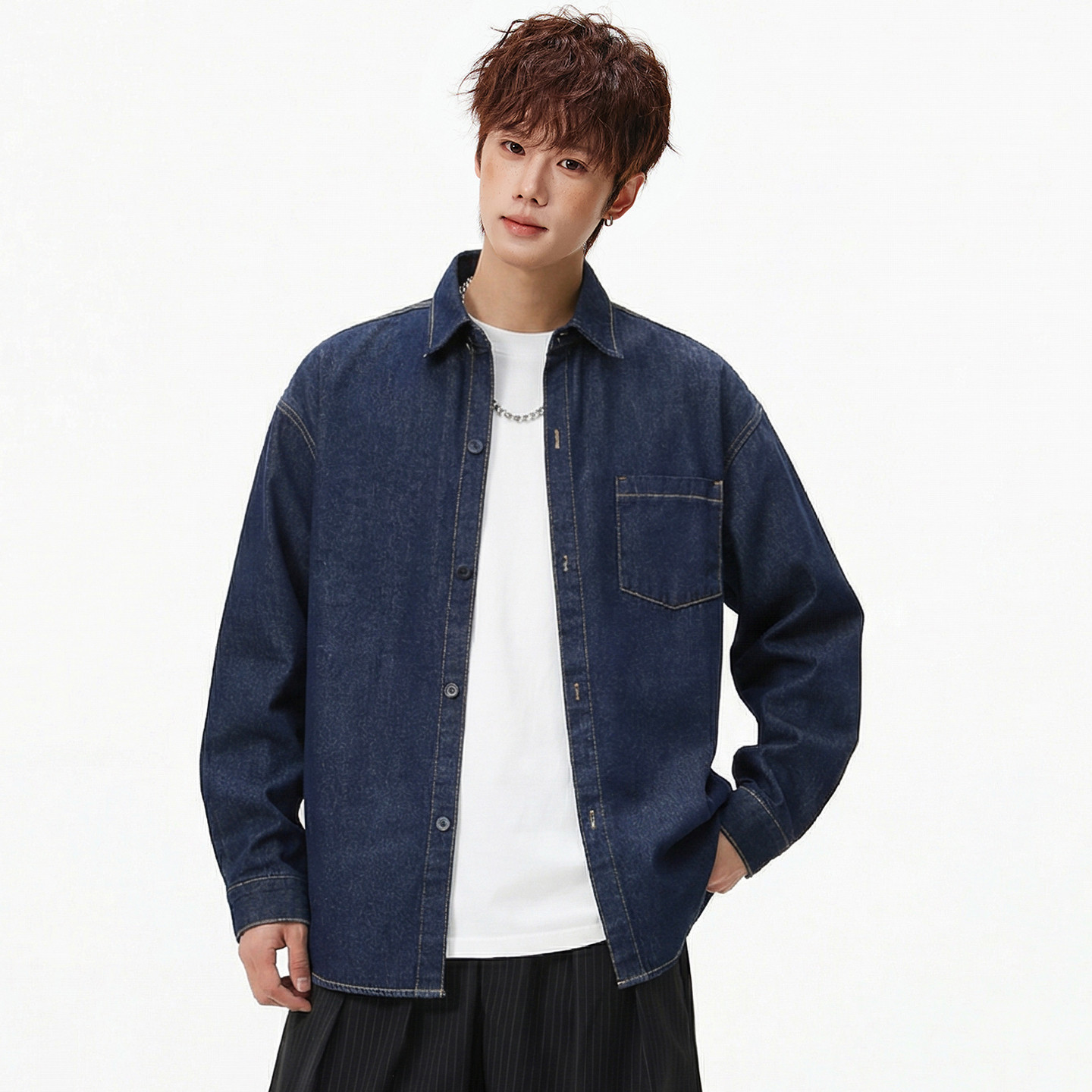 男士莱赛尔深蓝色牛仔衬衫男2026新款春季大码男装上衣长袖衬衣潮