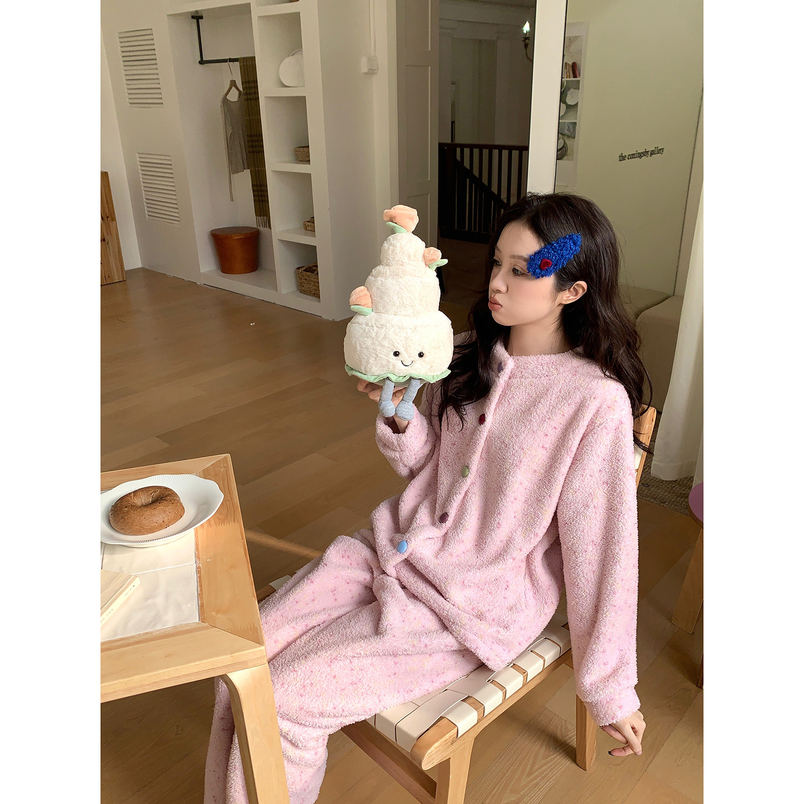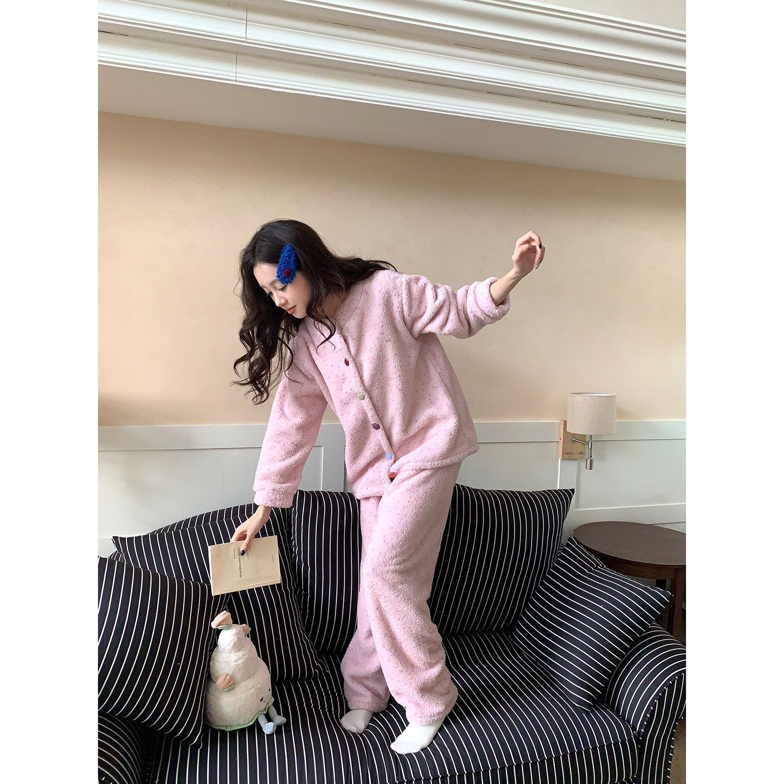 馨帮帮Homedress 彩色纽扣圆领开衫珊瑚绒保暖睡衣女冬家居服套装