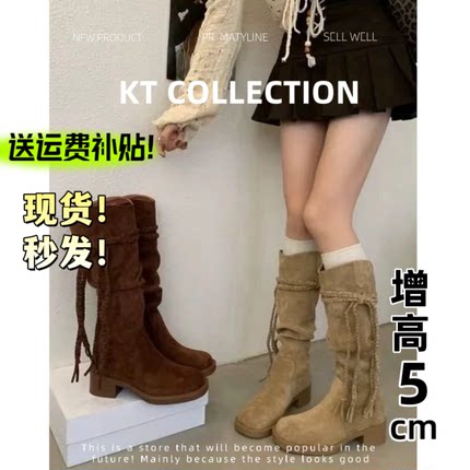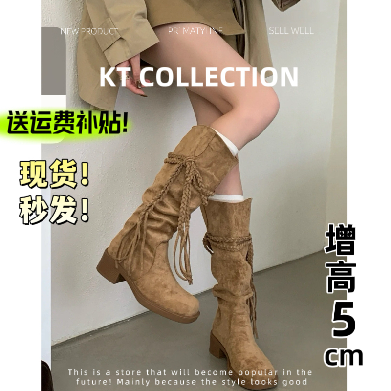 羊皮版!增高5cm~复古废土风流苏骑士靴粗跟不过膝长筒靴堆堆靴