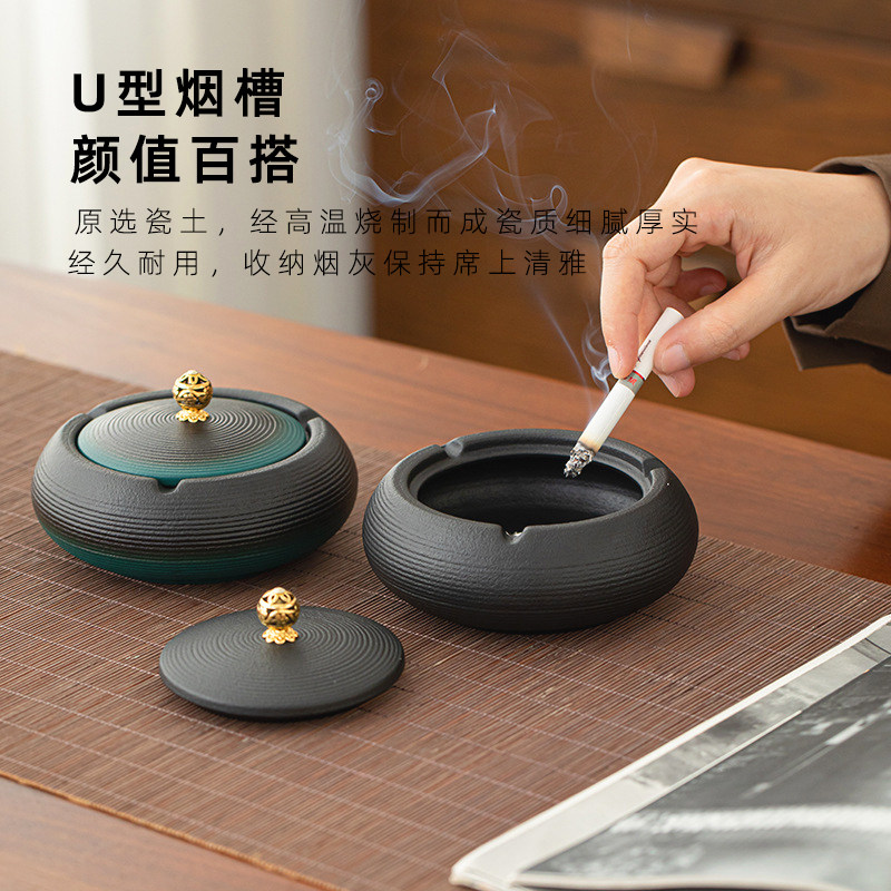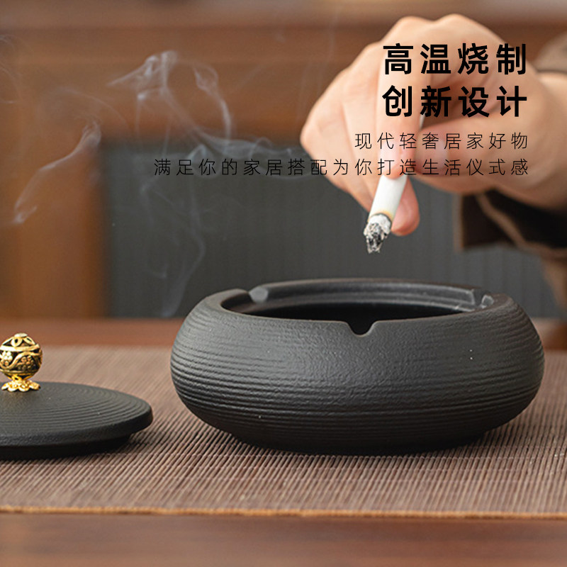 紫泉涧粗陶带盖烟灰缸中式家用
