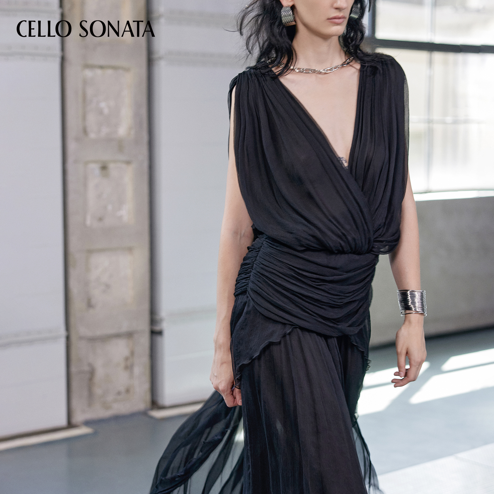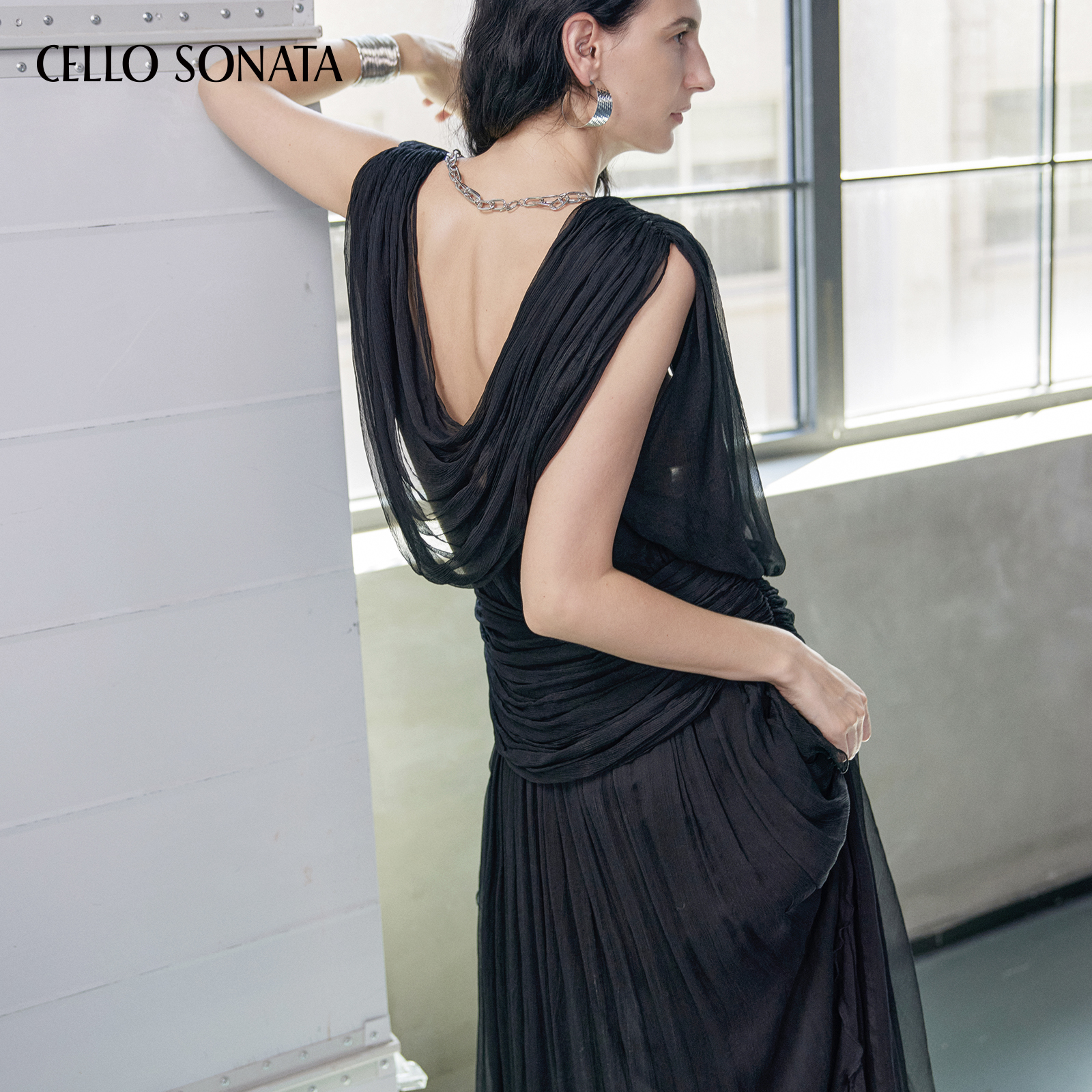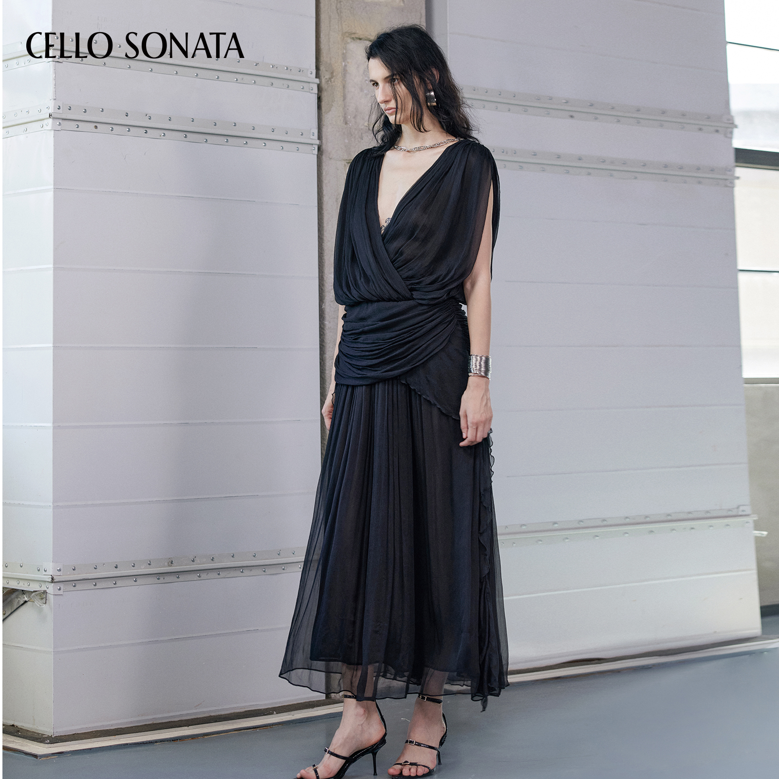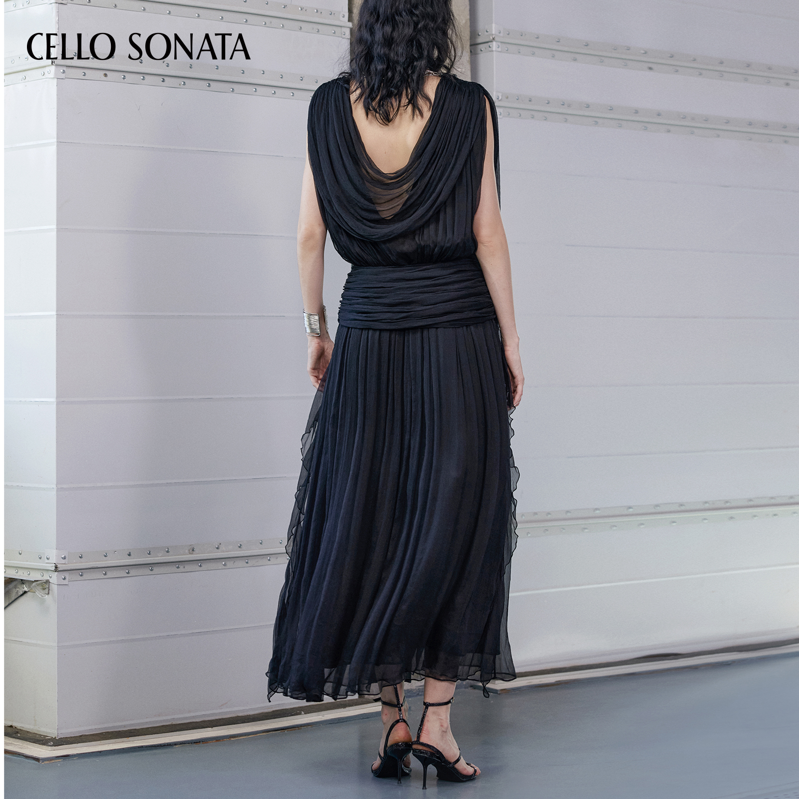 Cello SonataTS5早春系列 黑色人丝真丝抽皱长裙礼服高级感连衣裙