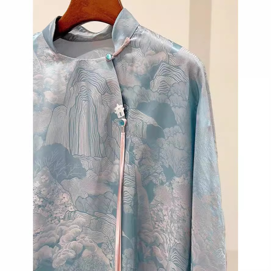 新中式湖蓝色提花斜襟醋酸衬衫女2024年春季国风高端气质独特衬衣