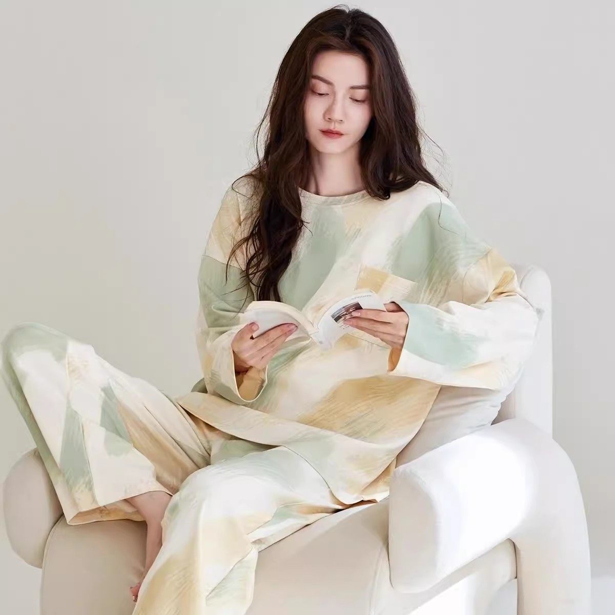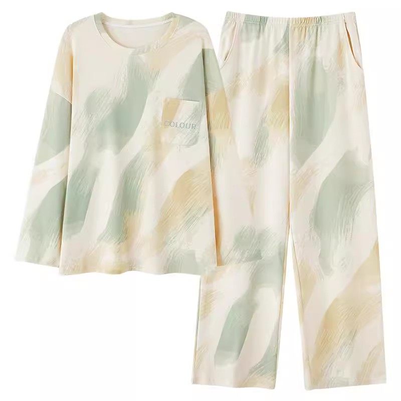 睡衣女款春秋季新款纯棉带胸垫长袖宽松休闲可外穿家居服套装圆领